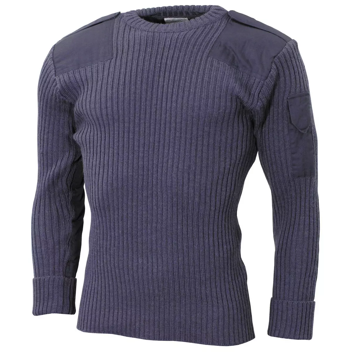 Brittiläinen villapaita, siniharmaa, ylijäämä. O-aukkoinen brittivillapaita on älyttömän lämmin ja hyvä ja halpa paita lämmittämään ylävartaloasi. Paidoissa epolettipaikat olkapäissä. Olkapäissä sekä kyynärpäissä polyesterikangasvahvistus. Vastaa pitkälti suomalaista intin mallia. Paita on malliltaan toisen maailman sodan mallia ja siitä käytetäänkin nimeä kommandovillapaita.