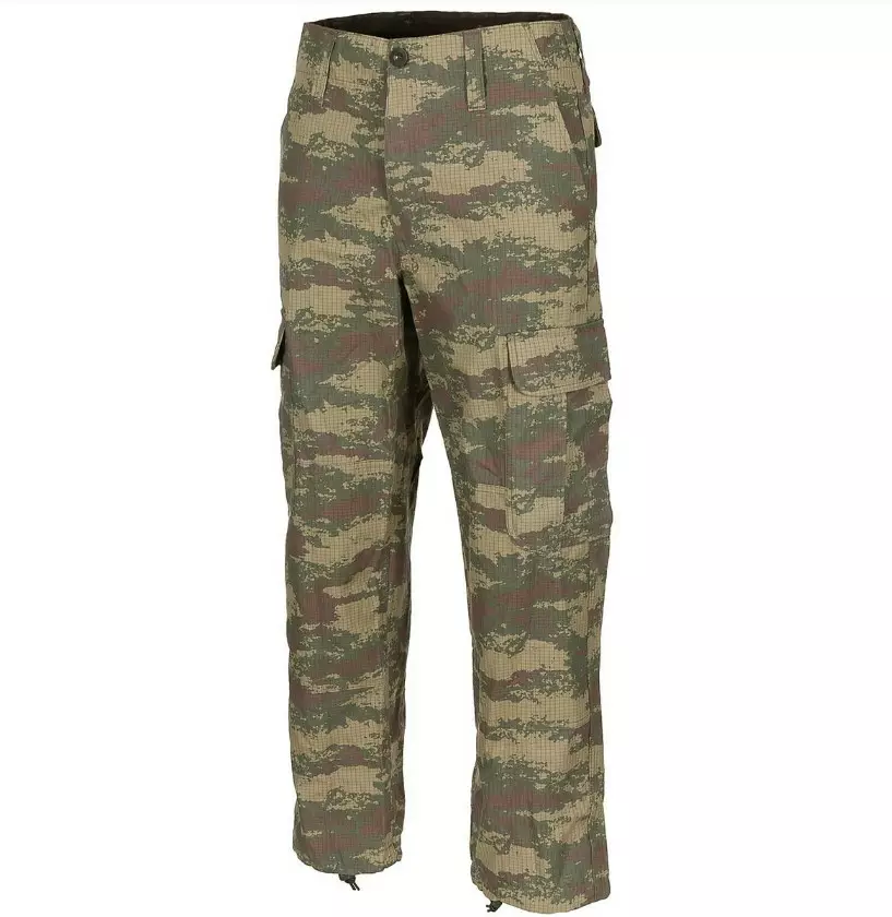 Turkkilaiset Tubitak maastohousut M2008, ylijäämä. Ripstop -kankaiset Turkin kenttähousut sivu, reisi- ja takataskuilla. Housuijen reisitaskut ja takataskut sulkeutuvat kanada-napeilla. Vyötärössä lyhyehkö nappisäätö ja kahdet päällekäiset vyölenkit, joista alemmalle menee 30 mm housuvyö ja päälimmän väliin jopa 65 mm vyö. Takapuoli kaksinkertaisella kankaalla Sepaluksessa nappisulku. Puntin suussa kiristimellä varustettu joustonauha.