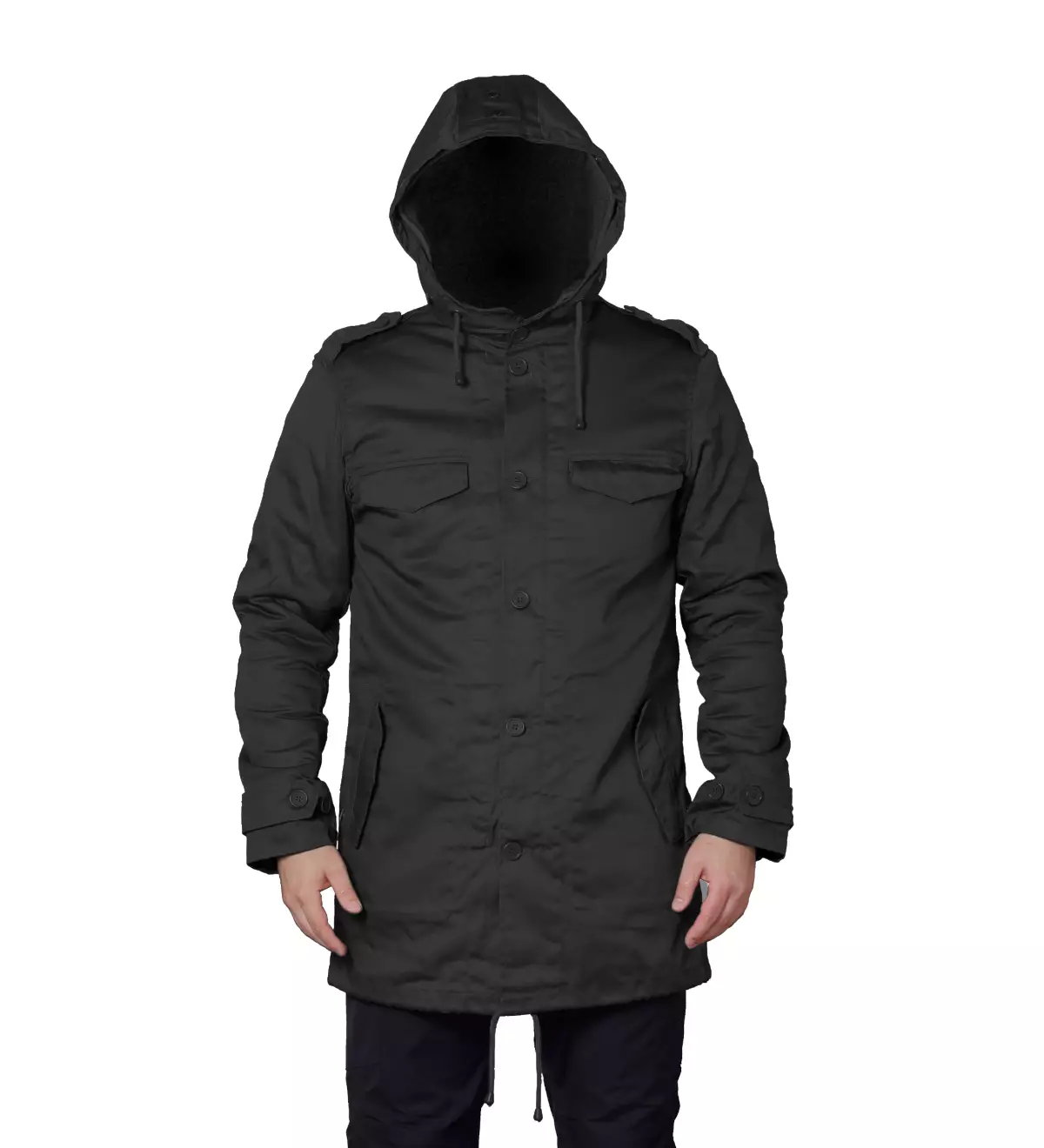 Brandit BW Parka takki forest, musta. Brandit on valmistanut Bundeswehrin parkasta varsin muodikkaan mutta silti hillitysti armeijahenkisen kopion, jossa irroitettava karvavuori. Parkatakista löytyy edestä kaksi nappisuljettavaa sivutaskua, kaksi nappisuljettavaa rintataskua sekä vuoresta löytyy povitasku. Hihojen suissa pari nappikiristystä ja resorissa sekä hupussa nyörikiristys. Takissa on riittävän iso huppu, jossa myös karvavuori, joten pää pysyy lämpimänä. Karvavuori on kiinnitetty sekä neppareilla, että napeilla. Takki sulkeutuu edestä vetoketjulla ja tuulisuoja napeilla. Takin päällyskangas on kestävää polyesteriä ja karvavuoreen on lisätty puuvillaa, jotta hengittää ja on mukavampi ihoa vasten.