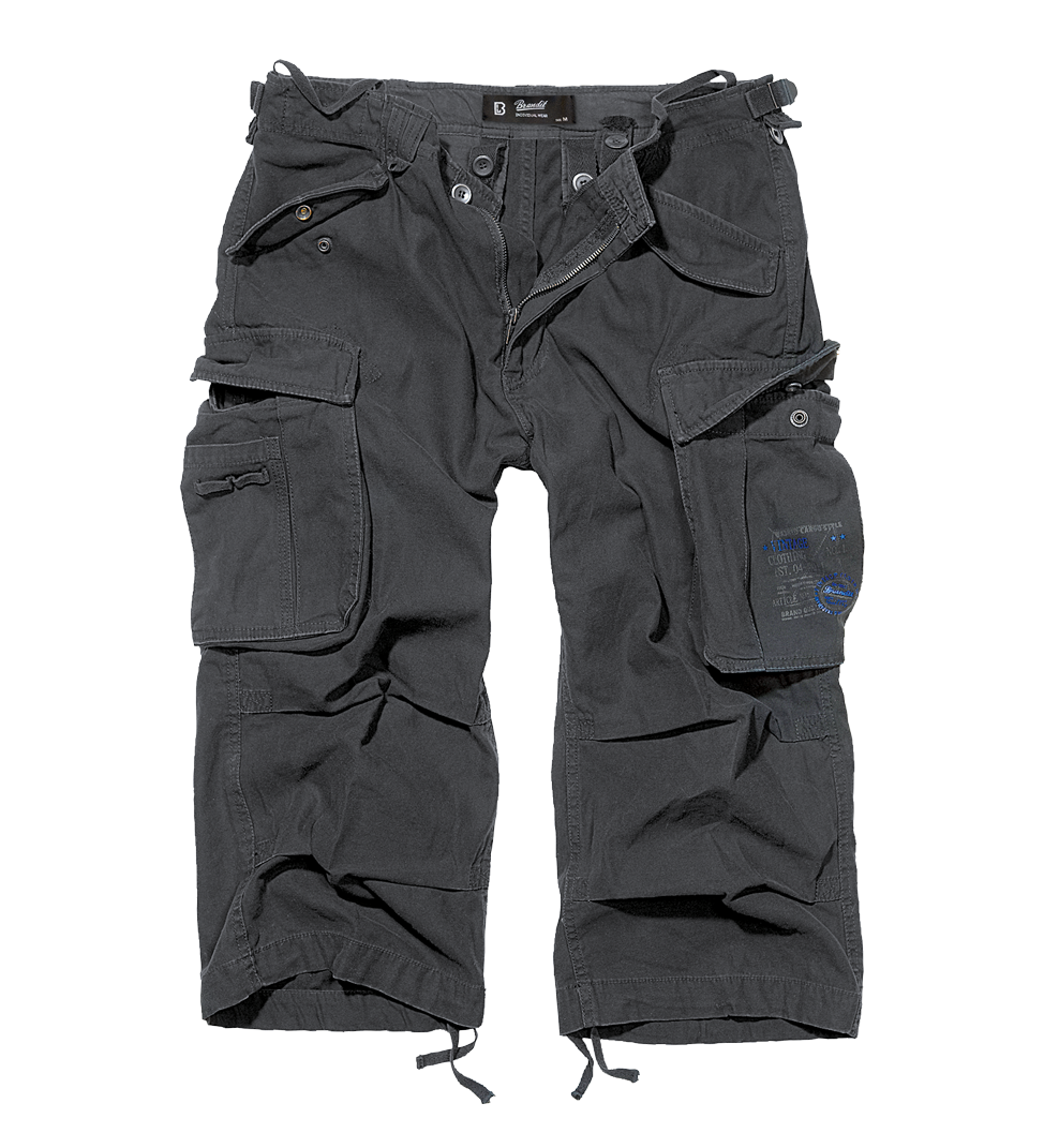 Brandit Industry Vintage shortsit, musta. Branditin 3/4 -lahkeiset shortsit. Shortseissa on läpälliset sivutaskut, isot nepparisulkeiset reisitaskut sekä takataskut. Vyötärössä nyörikiristys ja sepalus sulkeutuu vetoketjulla ja viimeistellään napilla. Lahkeissa myös nyörikiristys. Kangas on mukavaa puuvillakangasta.