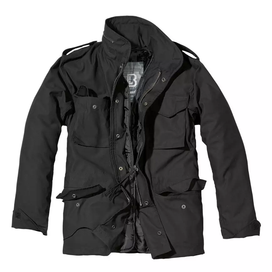 Brandit M65 maiharitakki vuorella, musta. Legendaarisesta M65 Rambotakin mallista valmistettu klassisemman näköinen talvitakki. Etupuolelta löytyy neljä nepparilla sulkeutuvaa pystytaskua. Varustettu irroitettavalla vuorella, joka kiinnittyy napeilla. Kauluksessa vetoketju, jonka sisällä ohut huppu. Kauluksessa myös napit ja velcroa tuhdimman hupun kiinnitystä varten. Soveltuu hyvin niin välikausitakiksi kuin talvitakiksi. Koska tässä on irroitettava vuori ja jos valitset liian ison koon, niin poistettaessa ilman vuorta saattaa takki näyttää isolta päällä. Se on sellainen asia jolle ei oikein voi mitään, joten suosittelemme tätä pääasiassa talvitakiksi. Hihojen suut ovat v-malliset, joissa sisäpuolella velcrotarra. Käytännössä nämä käännetään sisään ja niitä ei varmaankaan kukaan käännä alas auki. Syy miksi se on v-mallinen lienee se, että saat kämmenen selän pidettyä lämpimänä.