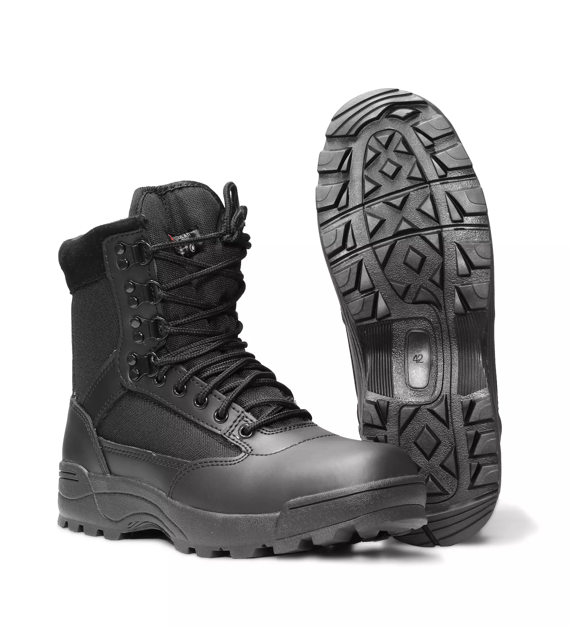Taktiset maiharit, musta, Brandit. Branditin taktiset vetoketjulliset maiharit ovat kevyet varsikengät, jossa materiaalina on käytetty nahkaa, 1200 denierin polyesterkangasta sekä lämpöä säätelevää Thinsulate-vuorta. Pohja on kumia, joka soveltuu niin maastoon kuin kadullekkin. Kantapäässä on iskunvaimennus. Nauhoituksen sekä vetoketjun asiosta nopeat ja helpot vetää jalkaan. Pehmustettu varsi ja tukeva kantakuppi. Maihareiden mitoitus sopii suhteellisen hyvin suomalaiseen jalkaan, joten voit valita koon sen mukaan mihin olet tottunut. Tämä on jalkine, jossa hinta-laatu -suhde on erittäin hyvä. Tämä jalkine ei ole ammattikäytön jalkine, toki voit käyttää tätä järkkäri- ja ressuhommissakin. Yleisesti käytetty koirankusetuksessa, aloitteville airsoftissa ja perus kaupunkimaiharina. On siis varsin monikäyttöinen jalkine vapaa-aikaan. Jalkine ei ole vedenpitävä eli siinä ei ole esim. Gore-Tex -kalvoa.