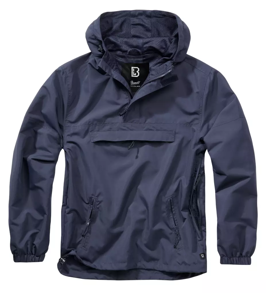 Brandit Windbreaker anorakki kesä, navy sininen. Tuulta pitävä ja vettä hylkivä anorakki, jossa huppu. Takissa verkkovuori, kaksi vetoketjullista sivutaskua ja suuri vetoketjullinen etutasku. Takissa verkkovuori, joten kosteus siirtyy iholta kivasti eteenpäin ja kuivuu nopeammin. Hupussa kiristysnyöri.