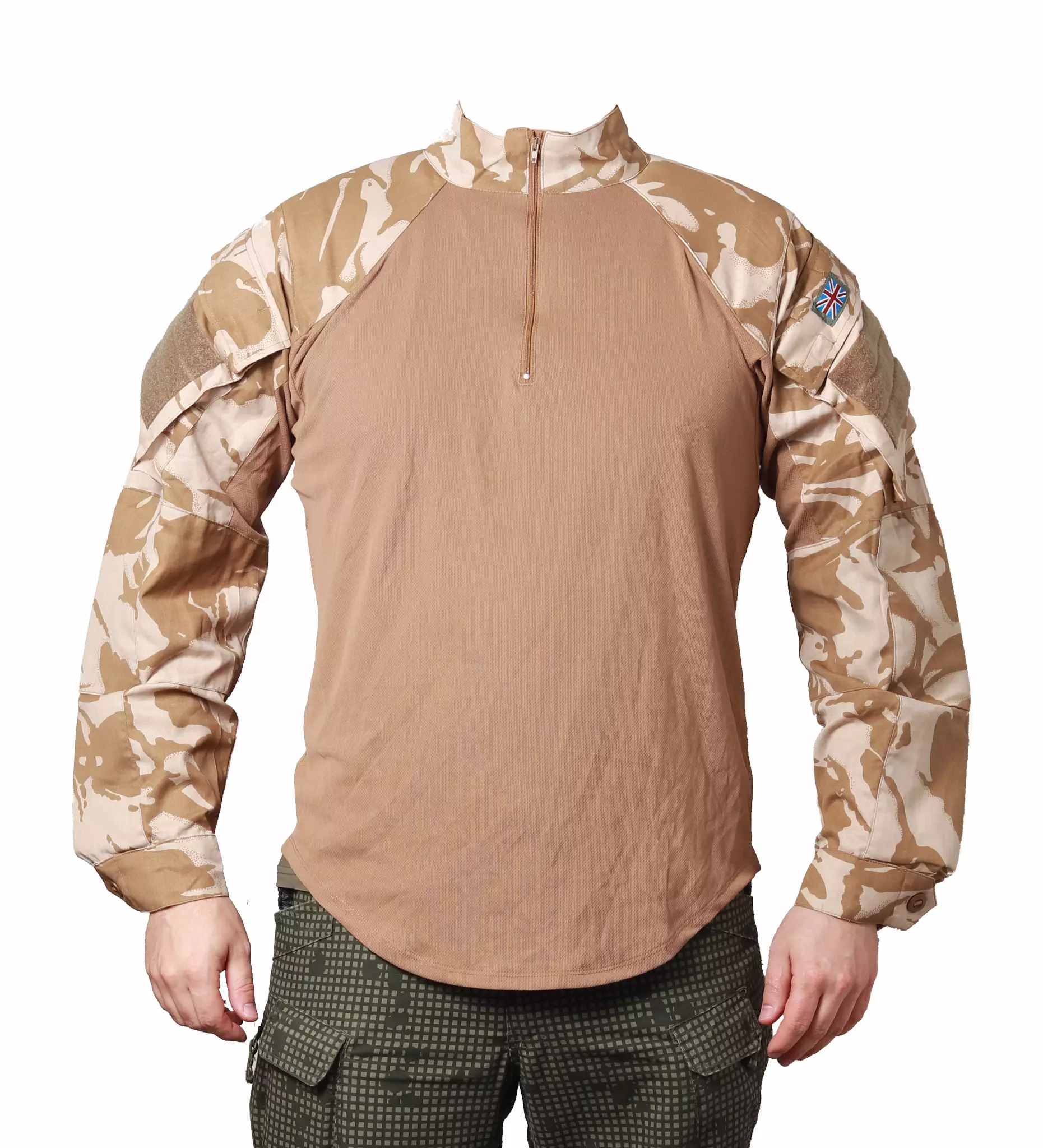 Brittiläinen Under Body Armour Shirt paita UBACS, DPM, aavikko, ylijäämä. Under Body Armour Combat Shirt (UBACS), eli siis sirpaleliivien kanssa käytettäväksi tarkoitettu taistelupaita kaulusvetoketjulla. Paidassa on puolikorkea pystykaulus, kaulusvetoketju ja nappikiristeiset hihat. Paidan hihoissa on toppausta iskuja vastaan ja paidan keskiosa on hengittävää ja nopeasti kuivuvaa teknistä kangasta. Samaa, kuin brittien teknisissä t-paidoissa. Pehmusteet saa halutessaan riisuttua hihan sisäpuolelta, pehmusteet lepäävät omissa pienissä taskuissaan. Näitä paitoja on tarkoitus pitää suojaliivin alla, jolloin tekninen kangas pitää keskivartalon kuivempana ja taistelu on mukavampaa. Sopii hyvin myös SRA, air-soft tai ihan vaan vapaa-ajan paidaksi.