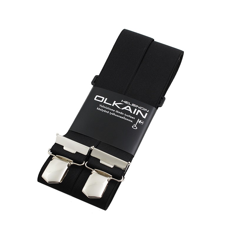 Henkselit H-malli 35 mm, musta. Helsingin olkaimen laadukkaat 35 mm leveät henkselit hauenleukakiinnityksellä. Henkseleissä lukittava säätökappale, joilla voit säädellä sopivaan pituuteen. Takuulukot pysyvät varmasti säädetyssä pituudessa. Kiinnitetään housuihin metallisella hauenleukaklipsillä. Näillä henkseleillä pysyvät housut ylhäällä, eikä käy ikäviä yllätyksiä.