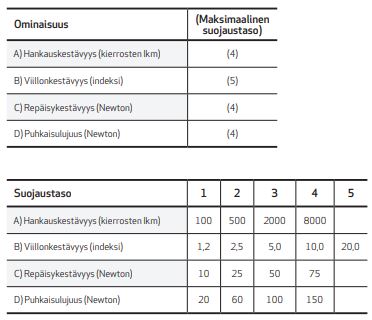 tietty nopeus (10 cm/min). Tässä korkein suojaustaso on 4,