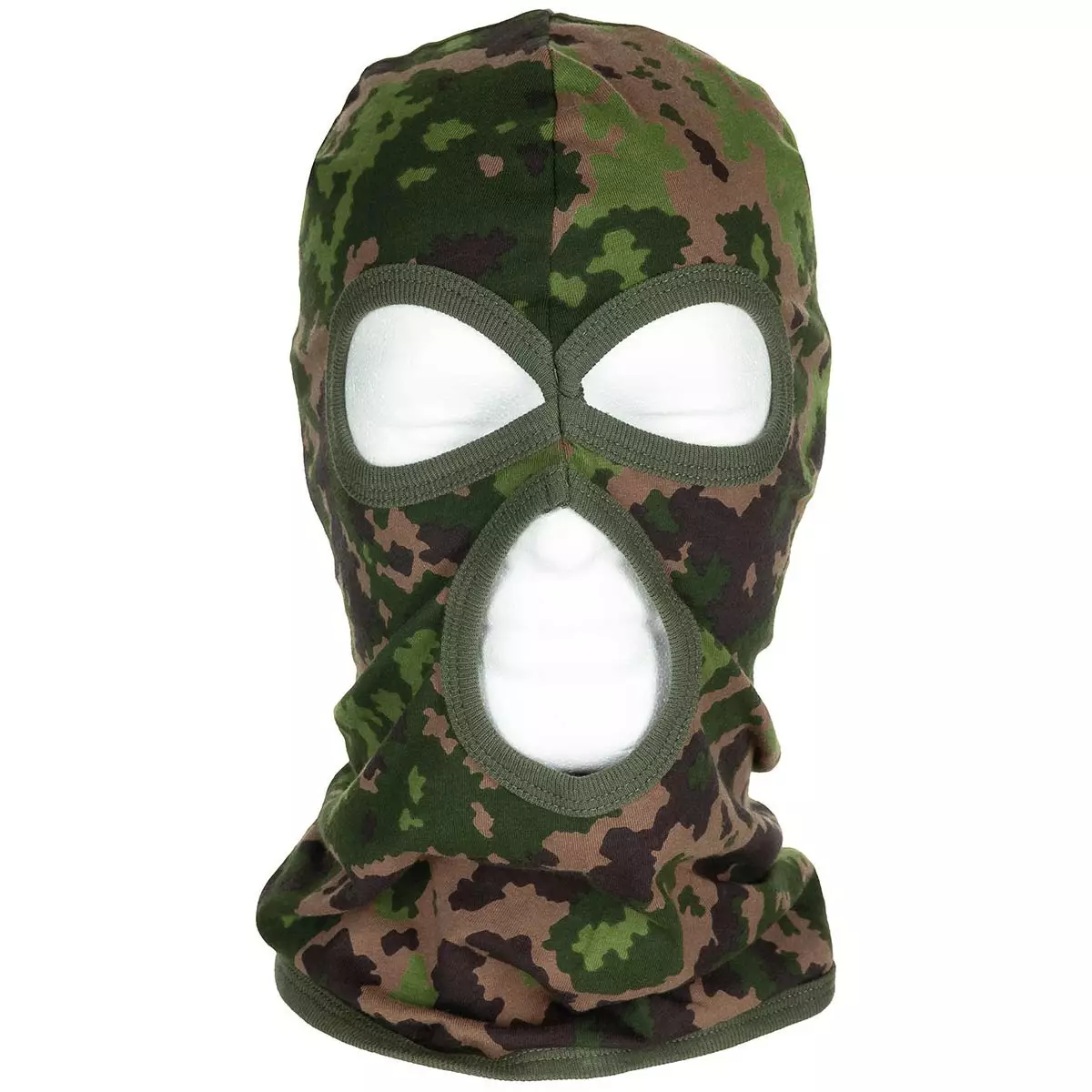Kypärähuppu puuvillaa silmä ja nenäaukolla, M05 maastoväri, MFH. Puuvillainen ohut M05 maastovärinen kypärähuppu, jossa aukko sekä silmille että nenälle. Tätä voit käyttää vaikka erilaisten kypärien alla suojaamassa naamaa ja päätä. Puuvilla on hyvä ja mukavan pehmeä iholle, joskin se kuivuu hitaammin kuin keinokuituinen materiaali. Materiaali on joustavaa, joten sopii eri kokoisille päille.