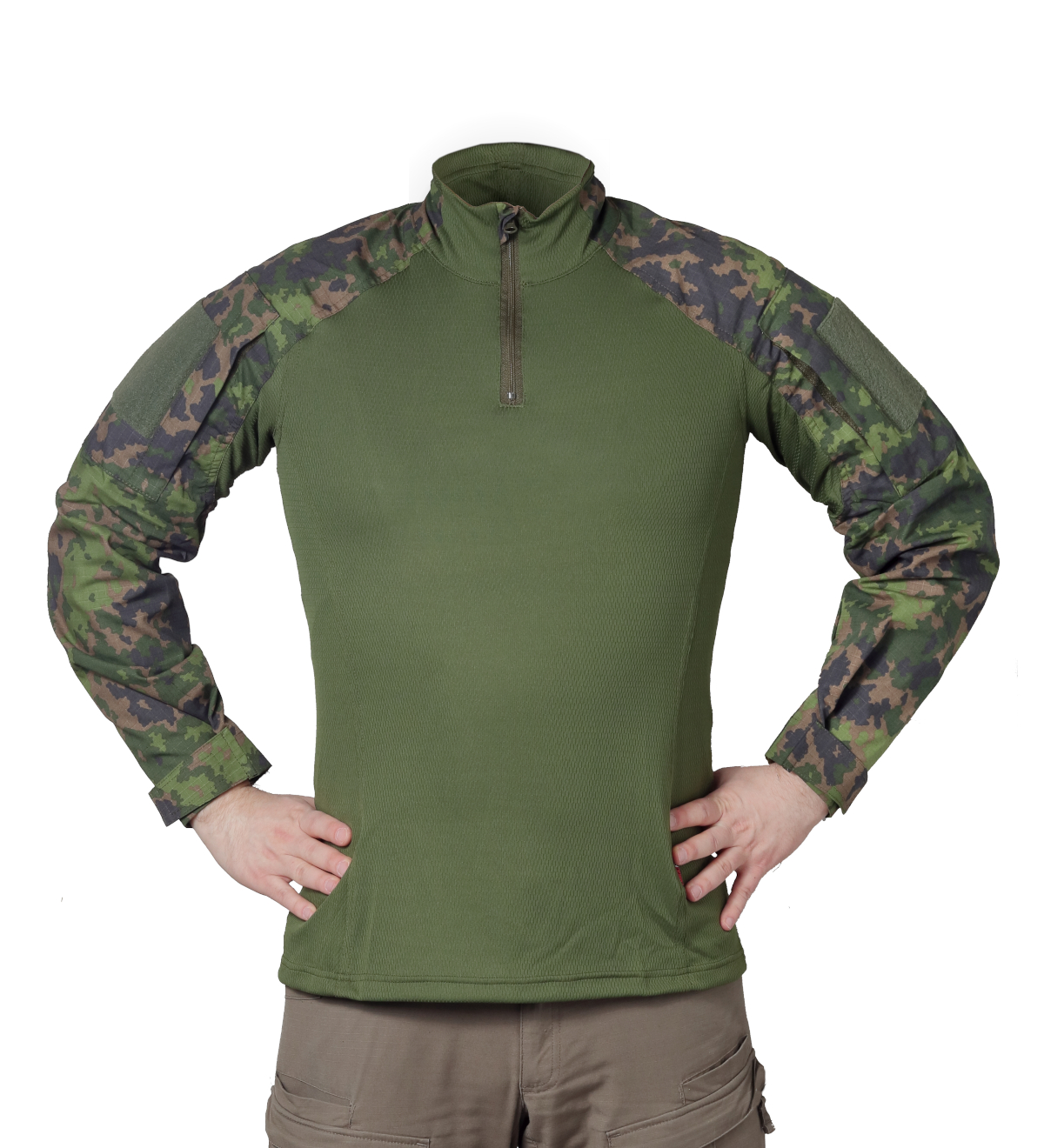 M05 Tactical® taistelupaita, metsäkuvio. Puolustusvoimien M05 paidasta hieman paranneltu taistelupaitamalli. Paidan vartalo-osan ja hihojen mitoitus on sama kuin PV:n vastaavassa mallissa. Päivitettiin tarrasuljettavat hihataskut vetoketjullisiin taskuihin, jotka ovat kätevämmät käyttää sekä ei ole niin äänekäs avattaessa kuin velcrotarrallinen versio. Taskuista tehtiin tarpeeksi suuret, joten niihin sopii esimerkiksi kohdealueen kartta tai GPS-paikannin. Hihataskujen päälle ommeltu 100 mm tarranauha vastaa puolustusvoimain IR- näkyvyysvaatimuksia. Sen lisäksi että tarranahaan voi kiinittä arvo- ja muista merkkejä, voidaan sen takana olevaan kynätakuun sijoittaa esimerkiksi multi-tool -työkalu. Aika kätsää.
