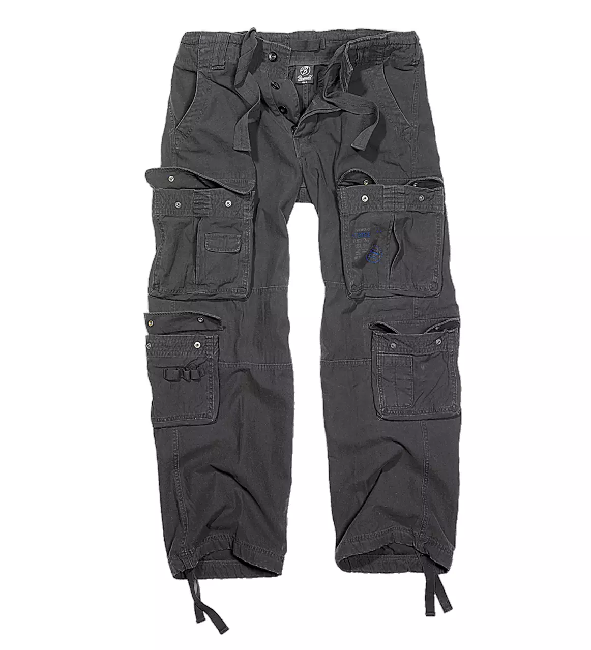 Brandit M65 Pure Vintage, musta. Brandit Wearin rennot puuvillaiset reisitaskuhousut. Housuissa on kaksi sivuaskua, kaksi nepparikiinnitteistä takataskua sekä kaksi isoa reisitaskua. Lisäksi kaksi polven alapuolella olevaa taskua. Vyötärössä ja lahkeensuissa nauhakiristys.