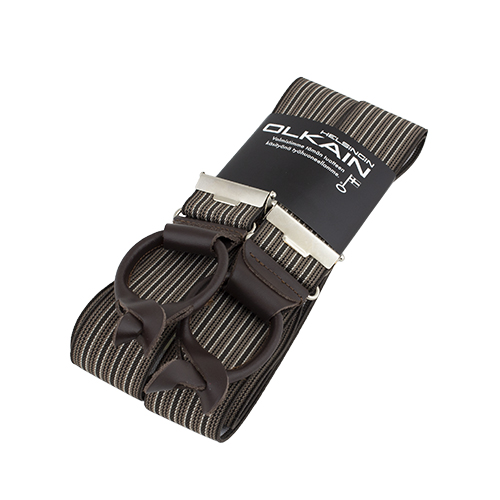Nappihenkselit 35 mm, liituraita, ruskea. Helsingin olkaimen laadukkaat 35 mm leveät henkselit nappikiinnityksellä. Henkseleissä lukittava säätökappale, joilla voit säädellä sopivaan pituuteen. Takuulukot pysyvät varmasti säädetyssä pituudessa. Housukiinnitys ommellulla nahkapalalla. Näillä henkseleillä pysyvät housut ylhäällä, eikä käy ikäviä yllätyksiä.