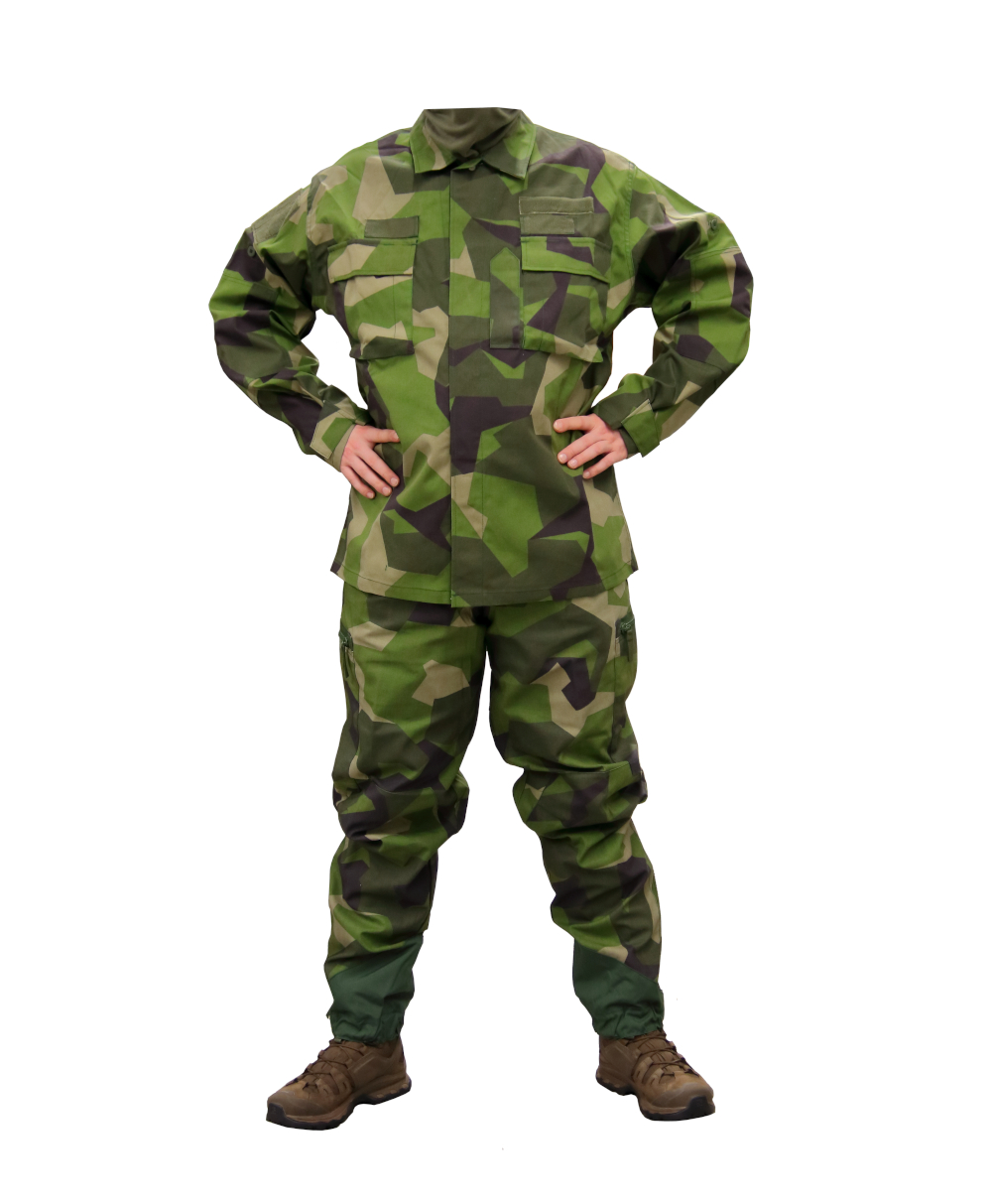 Ruotsin armeijan M90 maastopuku, ylijäämä.  Ruotsin armeijan Försvarsmaktenin 90 -luvulta käyttämä lehtikuvioitu "lövhögen" maastopuku. Kesäkuussa 2009 Ruotsin valtiopäivät teki päätöksen ammattiarmeijaan siirtymisestä ja näin olleen valtiopäivät sinetöi päätöksen yleisen asevelvollisuuden lakkauttamisesta 19. toukokuuta 2010, joten ruotsalaiselle sotilaskamalle ei enää ollut tarvetta. Niinpä kaikki hyvä kama on hävitetty ja näitäkin pukuja oli pitkään saatavilla pilkkahintaan. No niinhän siinä sitten kävi, että maan hallitus päätti palauttaa Ruotsiin yleisen asevelvollisuuden 2017. No tämäkin puku on tehty 90- luvun pieteetillä kuten niin moni sen ajan kama eli kulutusta kestäväksi.