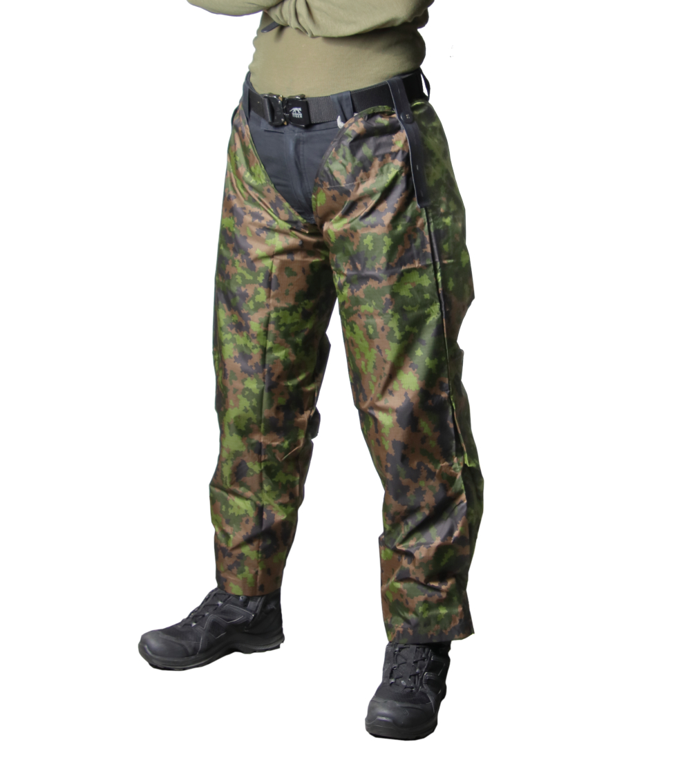 Sadelahkeet M05 metsäkuvio. Housujen päälle laitettavat sadelahkeet. Kangas täyttää puolustusvoimain IR-heijastusvaatimukset sulautuen näkymättömästi suomalaiseen luontoon. Sadelahkeet on pienillä, mutta tärkeillä yksityiskohdilla parannettu malli perinteisistä puolustusvoimain sadelahkeista. Kangas on polyesteriä, jossa taustalla housunlahkeet kuivana pitävä polyuretaani kerros. Polvitaipeissa muotolaskokset lisäävät liikerataa. Lahkeet kiinnitetään housun vyön tai vyölenkin ympärille säädettävällä nappikuminauhalla. Lahkeen suun voi sulkea kengän varren ympärille tarranauhalla.