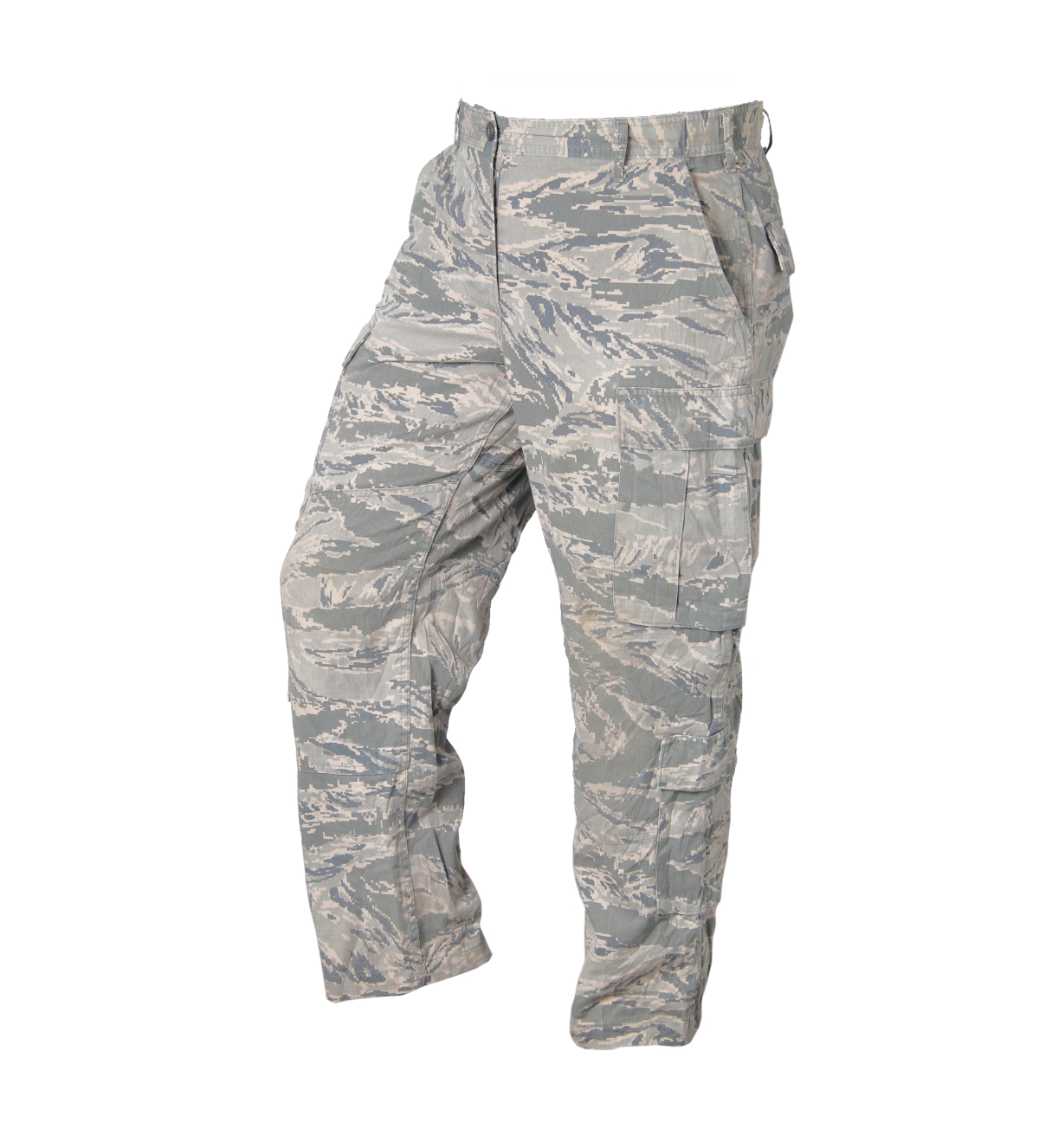 US Air Force ABU reisitaskuhousut, ylijäämä. Jenkki-ilmavoimien ABU (Airman Battle Uniform) Digital Tiger Stripe -kuvioiset käytetyt ylijäämä maastohousut. Housuissa on isot nappisuljettavat reisitaskut, sivutaskut, läpälliset nappisulkeiset takataskut ja pienet taskut pohkeissa. Lahkeiden suista löytyy kiristysnyörit (tai ainakin kujasto, johon saa pujotettua nyörin). Housut ovat reisistä väljät, joten liikkuminen näissä on mukavaa. Sepalus sulkeutuu napeilla ja vyölenkkeihin menee 40 mm vyö. Näissä on jonkin verran sekalaisia malleja, koska valmistajia on useita (mm. Tru-Spec, Atlanco, Rothco jne.). Väri on Tiger Stripe -kuvioitu harmaa eli vaikka aavikolle ja kaupunkiin sopiva. Jos haluat housut sopivan metsäiseen maisemaan, niin ICU (I see you) eli aika huono valinta. No näähän on sitten kaikkeen muuhun kivat hodet, kuten mökille olo housuiksi tms. Kangas on todella paksua puuvillakangasta (tai sekoitekangasta).