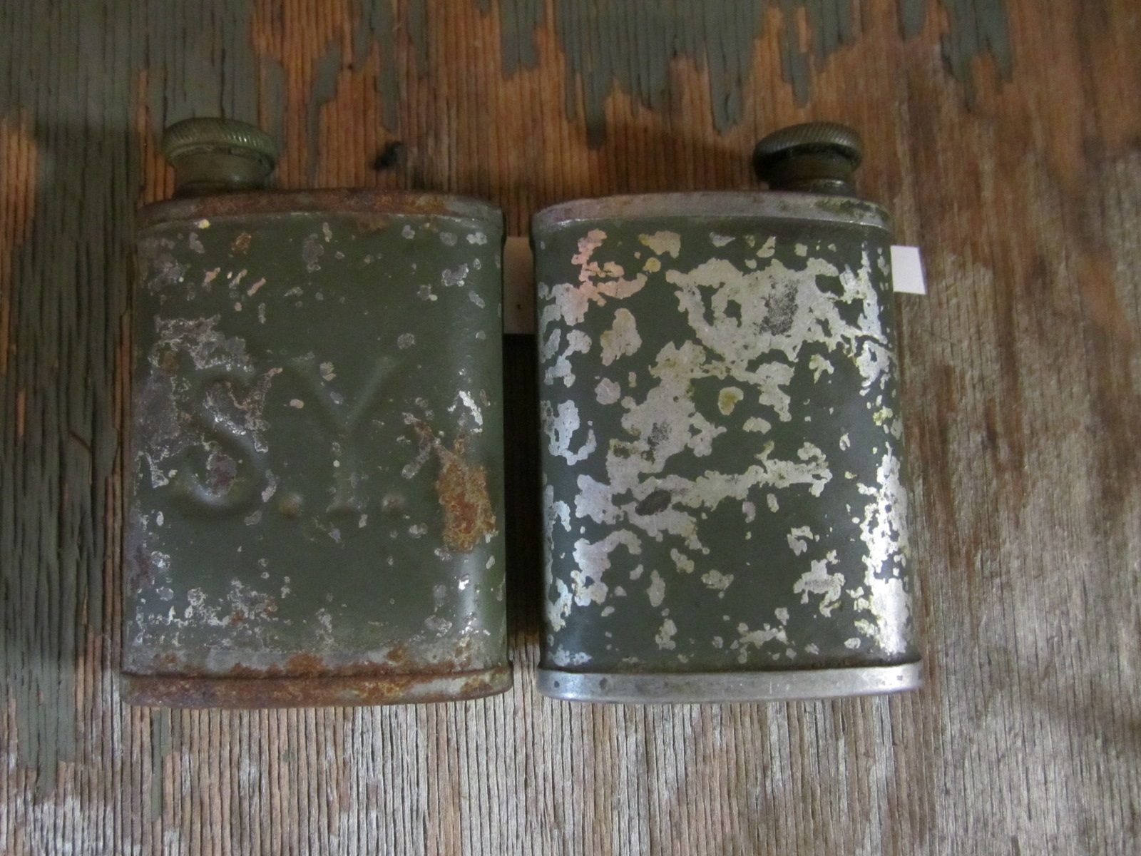 Suojeluskuntainyliesikunta aseöljypullo 1920-luku -31/34. Peltinen 8 cm korkea ja 5 cm leveä öljypullo. Kyljessä painokuviona S.Y. Korkissa on öljyämispuikko.