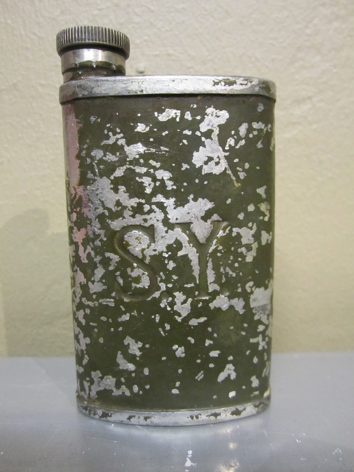 Suojeluskuntainyliesikunta aseöljypullo iso. Pulloja valmistettu 1931/34 - 1944. Suorakaiteen muotoinen, läpileikkaukseltaan soikea peltipullo, jonka kannen reunassa teräksisellä kierrekorkilla varustettu matala kaula. Toisella sivulla stanssaus S.Y. (Suojeluskuntain Yliesikunta). Saumat tinattu.