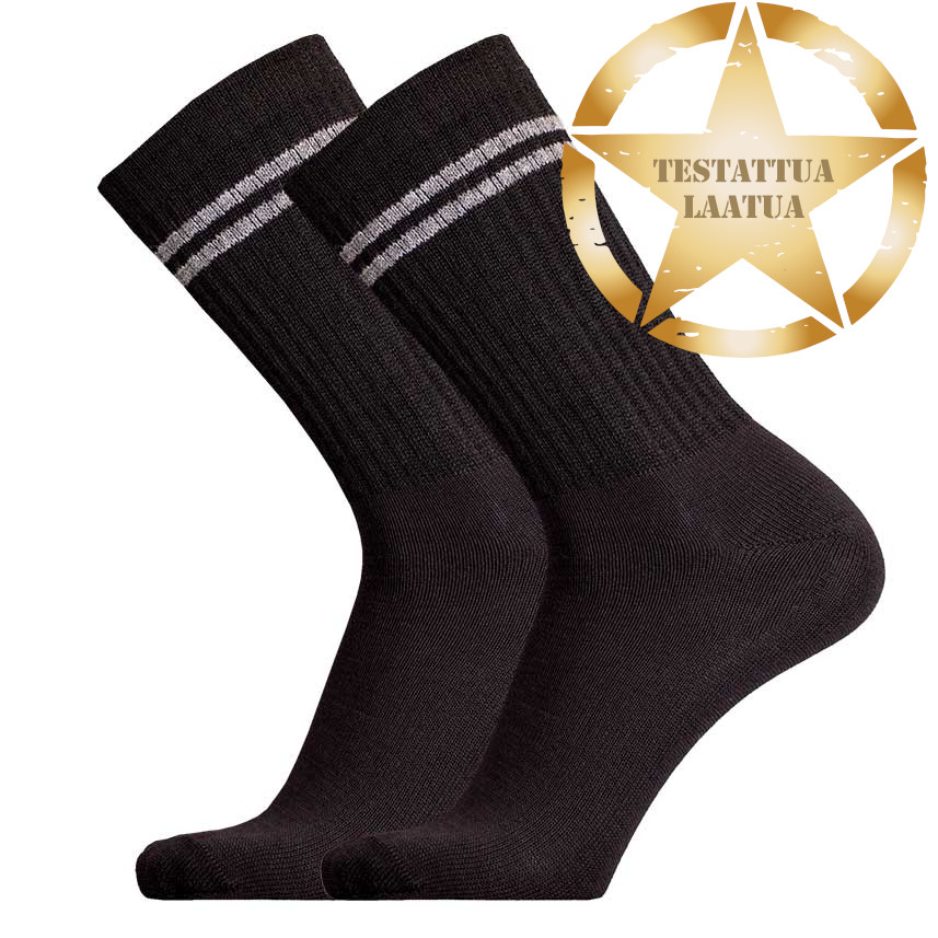 U.S.E. SA M05 armysukat, merinovillaa, musta. Suomen armeijan M05 sukan malliset, mustat merinosukat. Nämä on tosi hyvät perussukat jokapäiväiseen käyttöön tai vaikka toisiksi sukiksi, jos marssiessa käytät kaksia sukkia. Merino tuo villaan hyvät ominaisuudet, kuten lämpimyyden märkänäkin ja mukavuuden jalassa. Tekokuidut lisäävät sukan kestävyyttä ja joustavuutta. Merinovillaiset sukat ovat varsinkin Gore-Tex ja Sympatex -kalvokenkien kanssa parhaimmillaan ja vaikka jalka hikoilisikin kengässä ei tämä tunnu märältä ihoa vasten. Tämäkin tuote on Suomessa valmistettu avainlippu tuote!