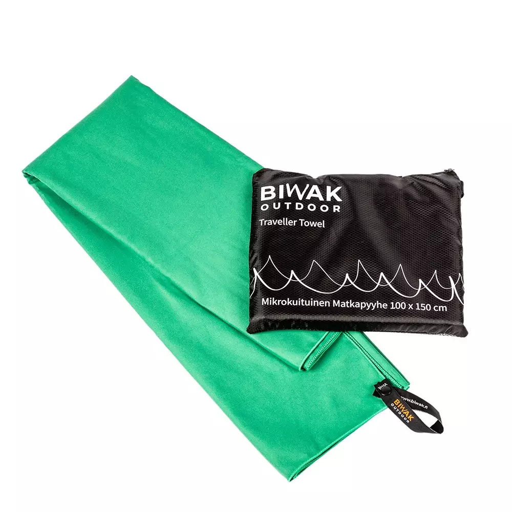 Biwak matkapyyhe 100x150 cm, vihreä. Matkapyyhe on valmistettu mikrokuidusta ja siinä on 30 000 kuitua/cm². Mikrokuitupyyhkeen imuteho on viisinkertainen puuvillaan verrattuna. Omaan painoonsa nähden mikrokuitupyyhe imee seitsenkertaisen vesimäärän. Pyyhe kuivaa ihosi märkänäkin!