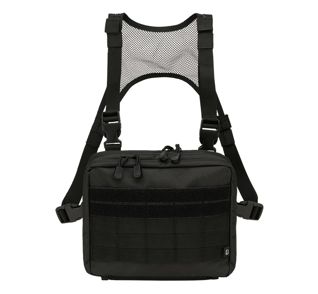 Brandit Chest Bag -laukku, musta. Branditin Ches Bag laukkuun/taskuun/rintapussiin saat järjestettyä kaikki pikkutavarat, kuten kompassin, kartan, multitoolin tai mitä ikinä keksitkin. Tasku on siitä kiva, että se on rajoitettu aukeamaan 90 asteeseen, joten voit lukea karttaa ilman käsiä. Tässä taskussa tai rintapussissa on irroitettavat valjaat ja saat tämän myös pienellä DIY -fiksauksella kiinni vaikka rinkan olkaimiin, joten valjaat voi jättää pois. Sisällä on hyvä määrä kaikenlaisia pieniä taskuja ja kohtia mihin kiinnittää kaikki kilkkeet. Tässä on kaksi erillistä vetoketjusuljettavaa taskua, joista toisessa paljon molle joustolenkkejä sekä karttatasku, joka irroitettavissa. Toisessa taskussa pari verkkotaskua, vetoketjullinen tasku sekä yksi rivi joustolenkkiä. Laukun etupuolella 5 x 5 molle kujastot, joissa kahdessa ylimmässä velcropörrö pintaa. Laukun ulkopuolella pohjassa pieni verkkotasku, jonne voit kätkeä vaikka kiristyssiteen.
