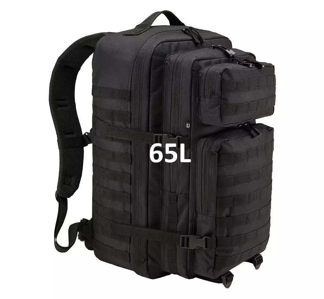 Brandit reppu Cooper Pack, XL, musta. Branditin Assault Pack XL rynnäkköreppu on todella iso reppu päivittäiseen käyttöön. Repussa on yksi iso päätasku, jonka sisällä kaksi pienempää taskua kaikenlaiselle pikkutavaralle. Repun selkäosassa on iso velcro -tarralla avattava lokero juomarakolle tai vaikka pienelle läppärille tai padille. Päätaskun jälkeen on toinen isohko tasku, jossa myös pienempiä taskuja sisällä. Tämän lisäksi edessä kaksi pintaan ommeltua pienempää taskua. Näistä pienemmässä ei ole sisätaskuja, mutta isommasta löytyy lokero lehtiölle ja kynille. Reppu on valmistettu kestävästä paksusta nailonista, joka on pinnoitettu PVC:llä, joten kestää kosteutta varsin hyvin. Reppu ei kuitenkaan ole täysin veden pitävä. Kaikki lokerot sulkeutuvat vetoketjuilla poislukien juomarakon tasku repun takaosassa. Repussa on riittävästi säätövaroja sekä molle -kujastoja (modular system), joihin saa kiinni kaikenlaista tavaraa sekä erillisiä molle -pusseja.