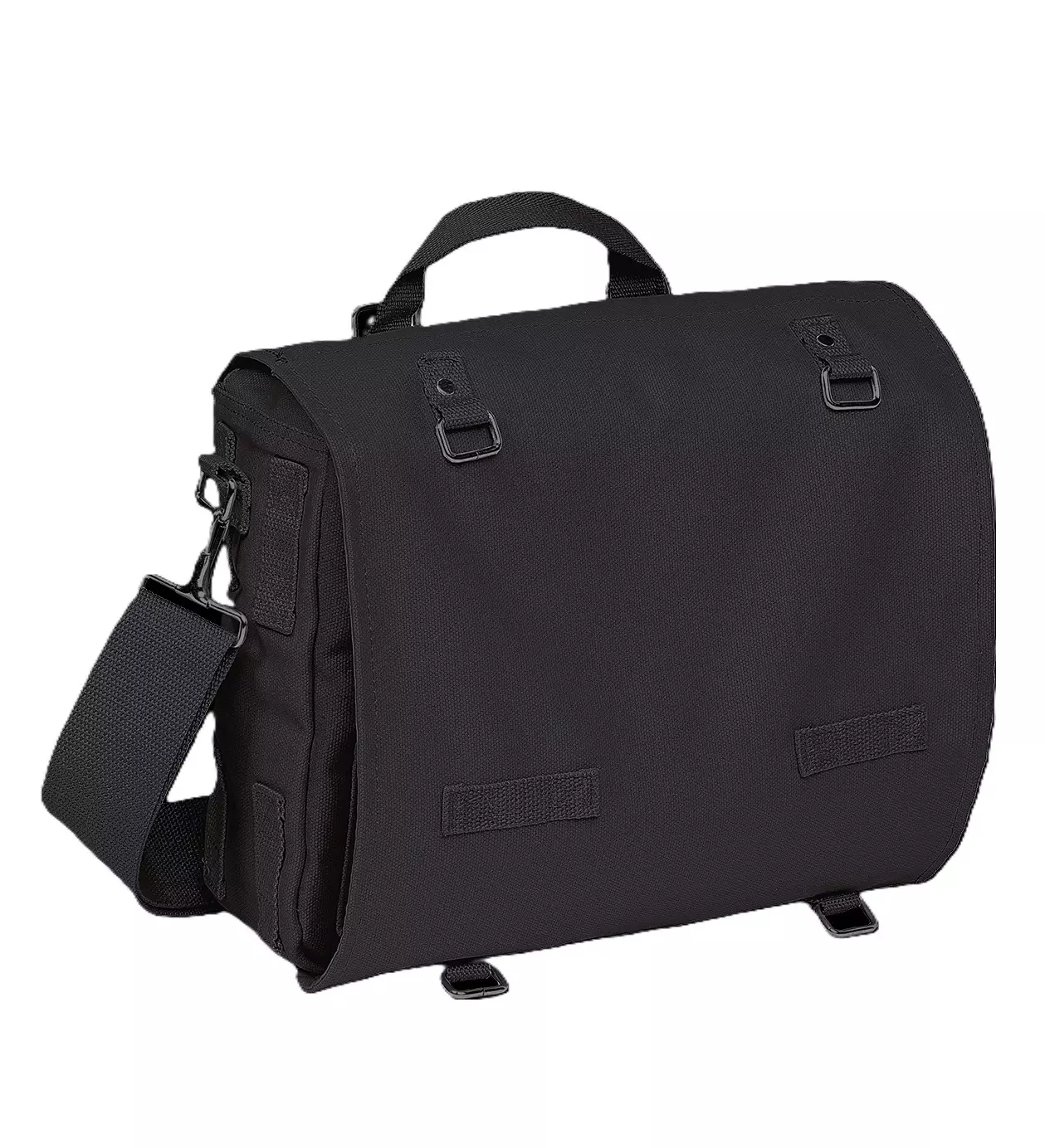 Brandit olkalaukku, musta. Puuvillakankainen Branditin valmistama canvas -laukku olkahihnalla. Laukussa on yksi iso päälokero, jonka sisällä pienempi tasku. Pääli läpän alla on pienempi nappisuljettu tasku, jonne saat pikku roinat järjestykseen. Läppä kiinnittyy hihnoista metallisten solkien väliin. Laukussa on irrotettava säädettävä olkahihna.