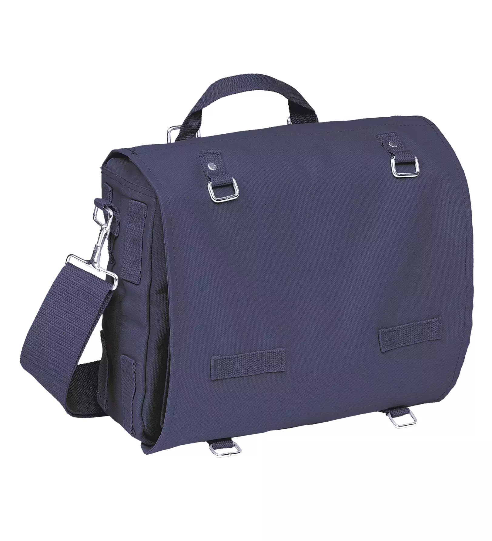 Brandit olkalaukku, navy sininen. Puuvillakankainen Branditin valmistama canvas -laukku olkahihnalla. Laukussa on yksi iso päälokero, jonka sisällä pienempi tasku. Pääli läpän alla on pienempi nappisuljettu tasku, jonne saat pikku roinat järjestykseen. Läppä kiinnittyy hihnoista metallisten solkien väliin. Laukussa on irrotettava säädettävä olkahihna.