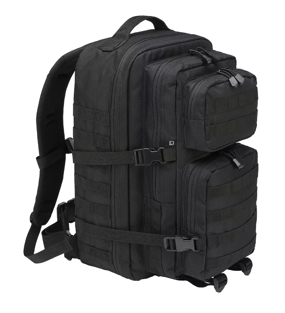 Brandit reppu Assault Pack, Large, musta. Branditin Assault Pack rynnäkköreppu sopii hyvin kaikenlaiseen päivittäiseen käyttöön ja retkeilyyn. Repussa on yksi iso päätasku, jonka sisällä kaksi pienempää taskua kaikenlaiselle pikkutavaralle. Repun selkäosassa on iso velcro -tarralla avattava lokero juomarakolle tai vaikka pienelle läppärille tai padille. Päätaskun jälkeen on toinen isohko tasku, jossa myös pienempiä taskuja sisällä. Tämän lisäksi edessä kaksi pintaan ommeltua pienempää taskua. Näistä pienemmässä ei ole sisätaskuja, mutta isommasta löytyy lokero lehtiölle ja kynille. Reppu on valmistettu kestävästä paksusta nailonista, joka on pinnoitettu PVC:llä, joten kestää kosteutta varsin hyvin. Reppu ei kuitenkaan ole täysin veden pitävä. Kaikki lokerot sulkeutuvat vetoketjuilla poislukien juomarakon tasku repun takaosassa. Repussa on riittävästi säätövaroja sekä molle -kujastoja (modular system), joihin saa kiinni kaikenlaista tavaraa sekä erillisiä molle -pusseja.