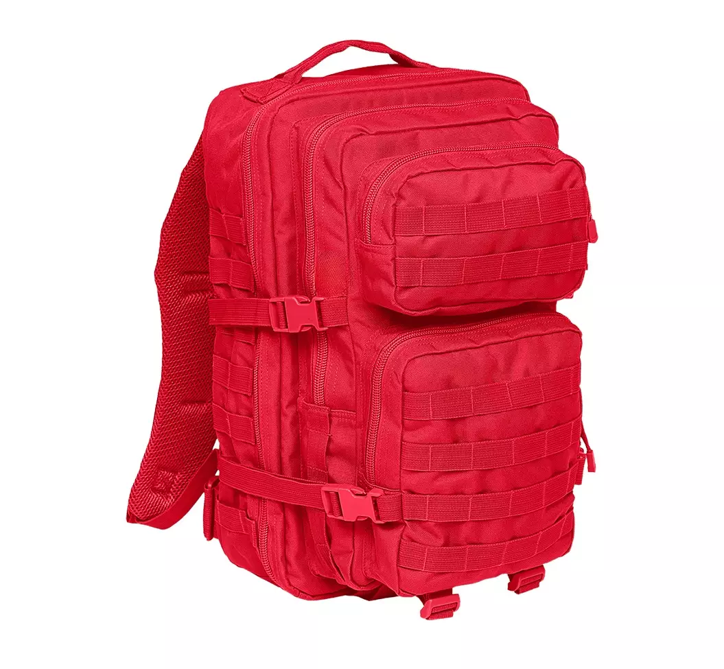Brandit reppu Assault Pack, Large, punainen. Branditin Assault Pack rynnäkköreppu sopii hyvin kaikenlaiseen päivittäiseen käyttöön ja retkeilyyn. Repussa on yksi iso päätasku, jonka sisällä kaksi pienempää taskua kaikenlaiselle pikkutavaralle. Repun selkäosassa on iso velcro -tarralla avattava lokero juomarakolle tai vaikka pienelle läppärille tai padille. Päätaskun jälkeen on toinen isohko tasku, jossa myös pienempiä taskuja sisällä. Tämän lisäksi edessä kaksi pintaan ommeltua pienempää taskua. Näistä pienemmässä ei ole sisätaskuja, mutta isommasta löytyy lokero lehtiölle ja kynille. Reppu on valmistettu kestävästä paksusta polyesteristä, joka on pinnoitettu PVC:llä, joten kestää kosteutta varsin hyvin. Reppu ei kuitenkaan ole täysin veden pitävä. Kaikki lokerot sulkeutuvat vetoketjuilla poislukien juomarakon tasku repun takaosassa. Repussa on riittävästi säätövaroja sekä molle -kujastoja (modular system), joihin saa kiinni kaikenlaista tavaraa sekä erillisiä molle -pusseja.