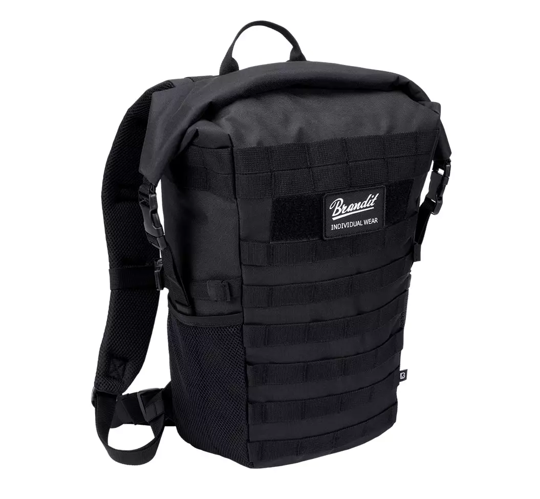 Brandit reppu Cooper Rolltop, musta. Branditin rolltop -reppu on kiva uutuus. Siinä on otettu huomioon kaikki hyvät ominaisuudet, kuten helppo rolltop -pussisulku, sivuissa verkkotaskut sekä pienet vetoketjutaskut ja edessä reippaasti molle -kujastoa. Kantoviilekkeet ovat pehmustetut, edessä D-lenkit ja säädettävissä alapäästä sopivaan mittaan. Repusta löytyy rintaremmi pikasoljella. Repun yläosassa takana nostokahva. Rolltop -pussisulku vain käännetään rullalle ja kiinnitetään päistään pikasoljilla. Edessä mollekujastojen välissä leveä velcrotarrapörrö, johon saat merkit kiinni.