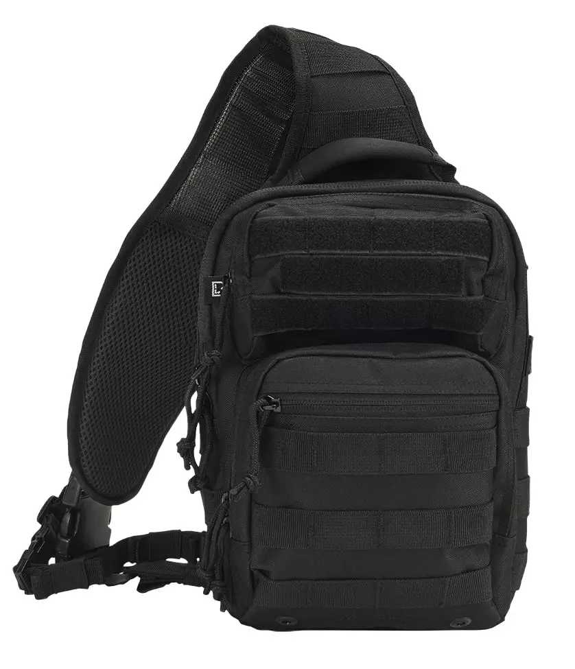 Brandit Sling Bag reppu, musta. Branditin yhden olkaimen pieni reppu reissuille päivärepuksi. Saat mukaasi pienen määrän eväitä ja vaikka sadeasun + muita kilkkeitä. Repussa yksi päälokero, joka sulkeutuu vetoketjulla. Päälokeron päällä kaksi vetoketjusulkeista taskua, joista ylempi pienempi. Ylemmän taskun päällä velcrotarrapörrö, johon saat moraalimerkkisi kiinni. Alemman taskun päällä molle / pals -kujastoa. Siinä on myös pieni vetoketjusuljettava tasku vaikka passille. Repun yläpäässä kantokahva. Olkain on säädettävissä riittävästi ja siinä on varmistus nauha, jolloin reppu ei vahingossa irtoa pois päältä. Olkaimessa myös kujastoa. Repun takana on nepparisulkeinen avotasku. Sen päällä on verkkomaista kangasta, joten hengittää hieman paremmin.