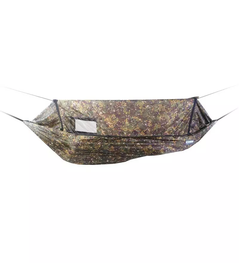 DD Hammocks Nest riippumatto, MC maastokuvio. Hyvin samantapainen kuin DD:n Frontline riippumatto. Erona on se, että hyttysverkon tilalla on camo-kuvioitu kangas. Hyttysverkon tilalla oleva kangas suojaa tuulelta, hyönteisiltä ja muiden katseilta. Pään kohdalla on verkkoikkuna, josta voi tarvittaessa kurkkia ulos, Kummassakin sivussa on täysipitkät kaksisuuntaiset vetoketjut ja riippumaton sisällä kaksi lenkkiä joihin, voi laittaa tavaroita roikkumaan.