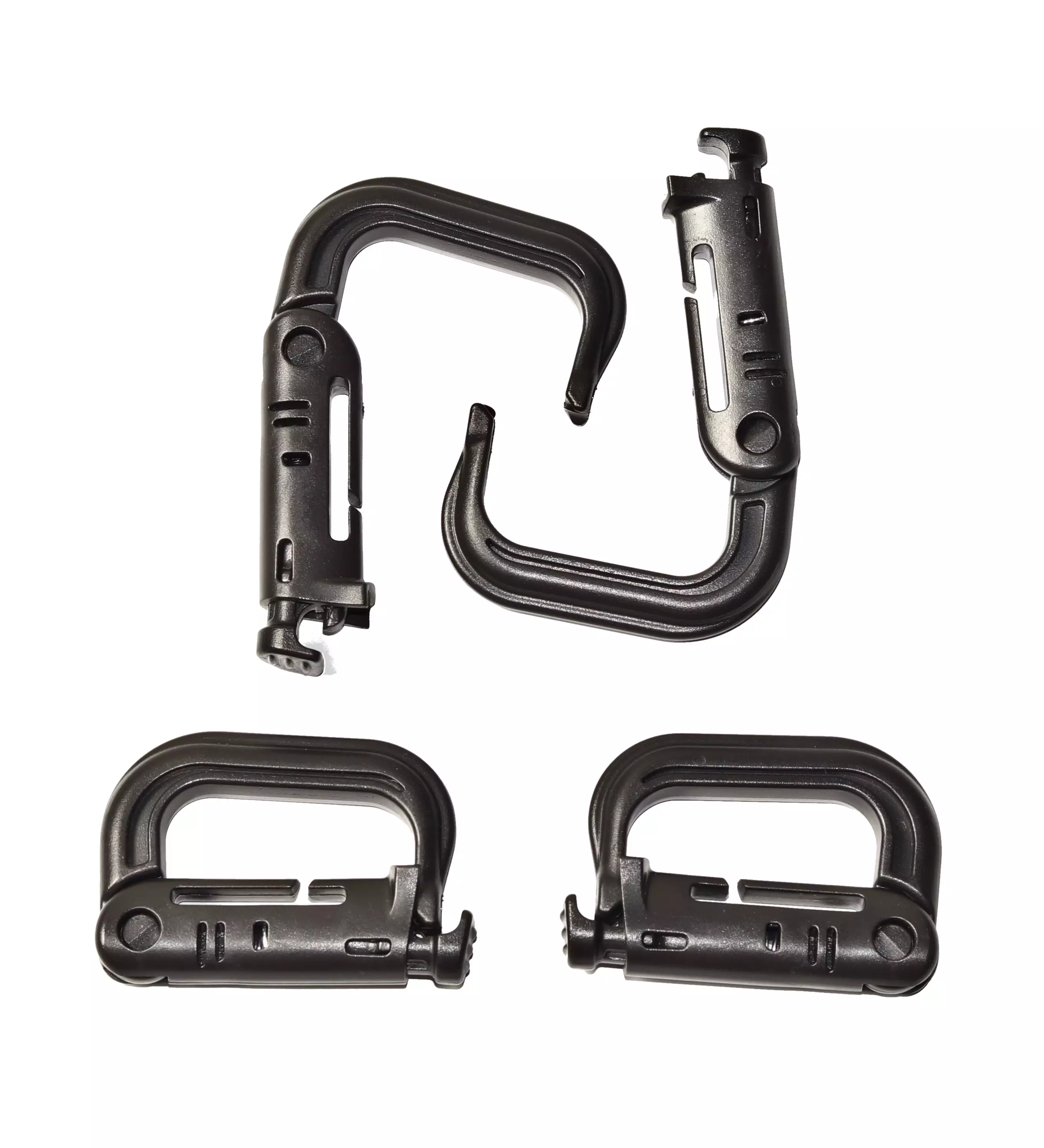 Grimloc karabiinit 4 kpl setti, musta. Muovinen Grimloc -karabiinihaka, jolla saat varusteesi kiinnitettyä tai roikotettua. Saat pujotettua tämän molle -kujastoon. Tämä haka ei sovellu kiipeilyyn tai riippumiseen vaan on tehty kevyitä rasitteita varten, kuten esimerkiksi juomapullon tai hanskojen roikottamiseen.