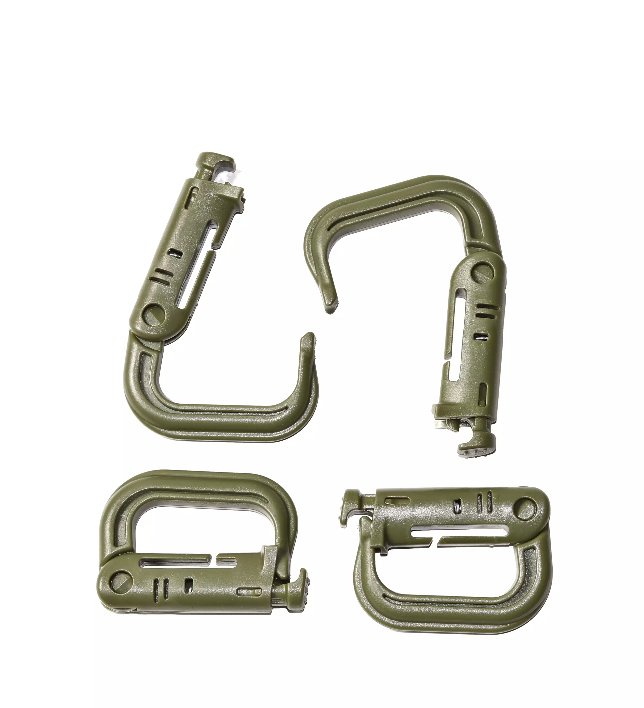 Grimloc karabiinit 4 kpl setti, vihreä. Muovinen Grimloc -karabiinihaka, jolla saat varusteesi kiinnitettyä tai roikotettua. Saat pujotettua tämän molle -kujastoon. Tämä haka ei sovellu kiipeilyyn tai riippumiseen vaan on tehty kevyitä rasitteita varten, kuten esimerkiksi juomapullon tai hanskojen roikottamiseen.