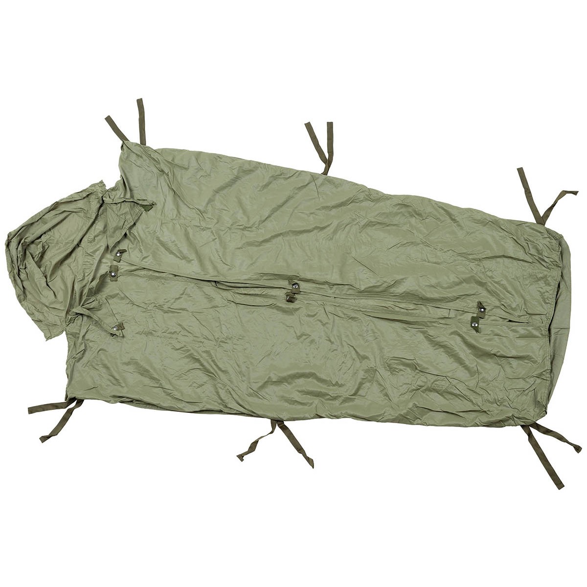 Hollantilainen makuupussin sisäpussi, ylijäämä. Pussin materiaali on ohutta verkkomaista nylonia tai polyesteriä. Pussin saa sivuista kuudella erillisellä nauhalla kiinni makuupussiin tai mikäli niille ei ole tarvetta, niin voit leikata ne pois. Edessä kolme nepparikiinnitystä makuupussiin. Eli nämä ovat valmistettu hollantilaisiin makuupusseihin, joten kiinnityspisteet ovat sen mukaan tehty. Pussin pituus voi vähän vaidella, mutta on noin 190cm päästä päähän. Soveltuu mainiosti makuupussin "lakanaksi" tai sellaisenaan lämpimillä kesäkeleillä.