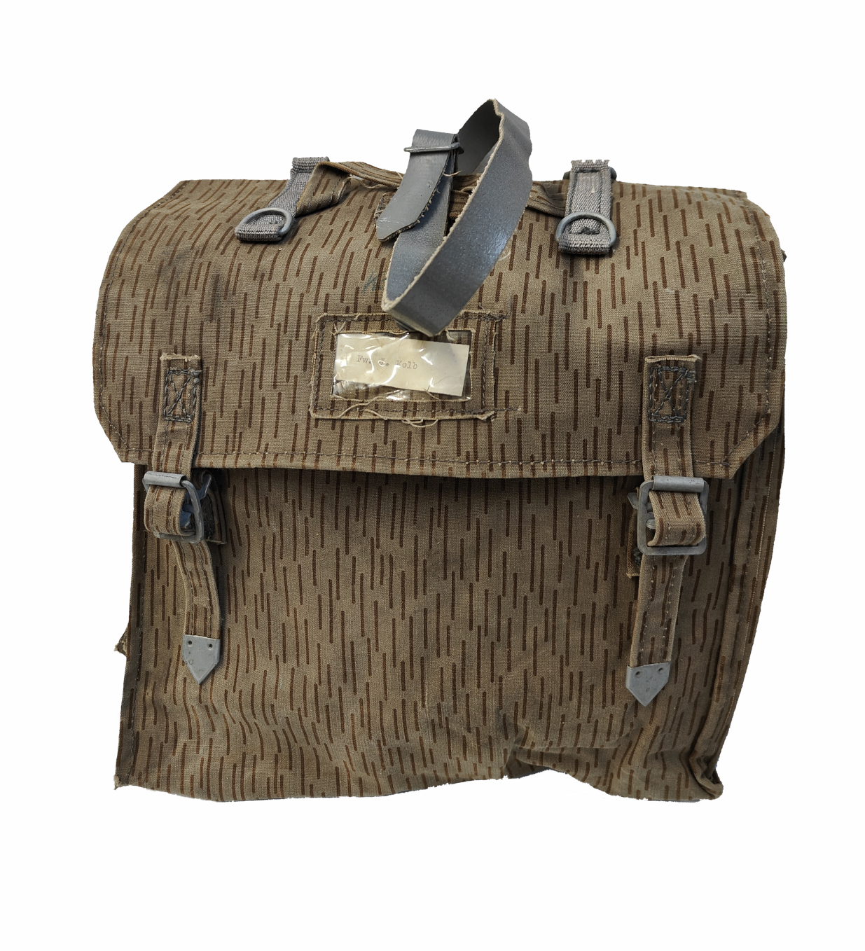 Itä-Saksan armeijan NVA laukku strichtarn -kuviolla, ilman olkaimia, ylijäämä. Tämä laukku huokuu retrohenkisyyttä. Näitä on ajan saatossa myyty näitä tiedä kuinka paljon ja iso osa on mennyt polkupyörän sivulaukuiksi. Tässä erässä ei ole mukana repun olkaimia, joten myydään laukkuna. Laukussa on kuitenkin hakaset, joilla repun voi kiinnittää vaikka tarakan kylkeen. Laukku on on kumitettu sisältä, joten on aika vesitiivis. Koska reput ovat sisältä kumitettu ja varastoitu, niin näissä on alkuun aika vahva kuminen tuoksu. Haju poistuu ajan myötä. Repun koko on noin 30 x 30 x 12 cm. Jos haluat repun jossa on olkaimet löydät sen täältä.