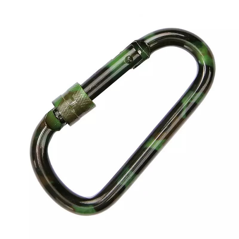 Karabiinihaka 75 mm ruuvilukolla, woodland. Alumiininen karabiinihaka tavaroiden ja varusteiden kiinnittämiseen esimerkiksi reppuun tai vyölenkkiin. Värinä woodland. Ei sovellu kiipeilyyn ja roikkumiseen.