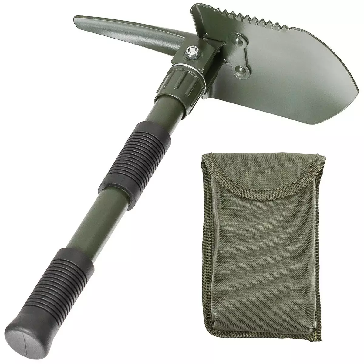 Lapio -hakku työkalu, 3 in 1, oliivinvihreä, MFH. Lapio - hakku yhdistelmä, jossa kahteen osaan purettava varsi. Voidaan käyttää lapiona, sahana tai hakkuna. Tämä hakku menee todella pieneen tilaan ja mahtuu helposti mukaan rekille tai autoon jne.