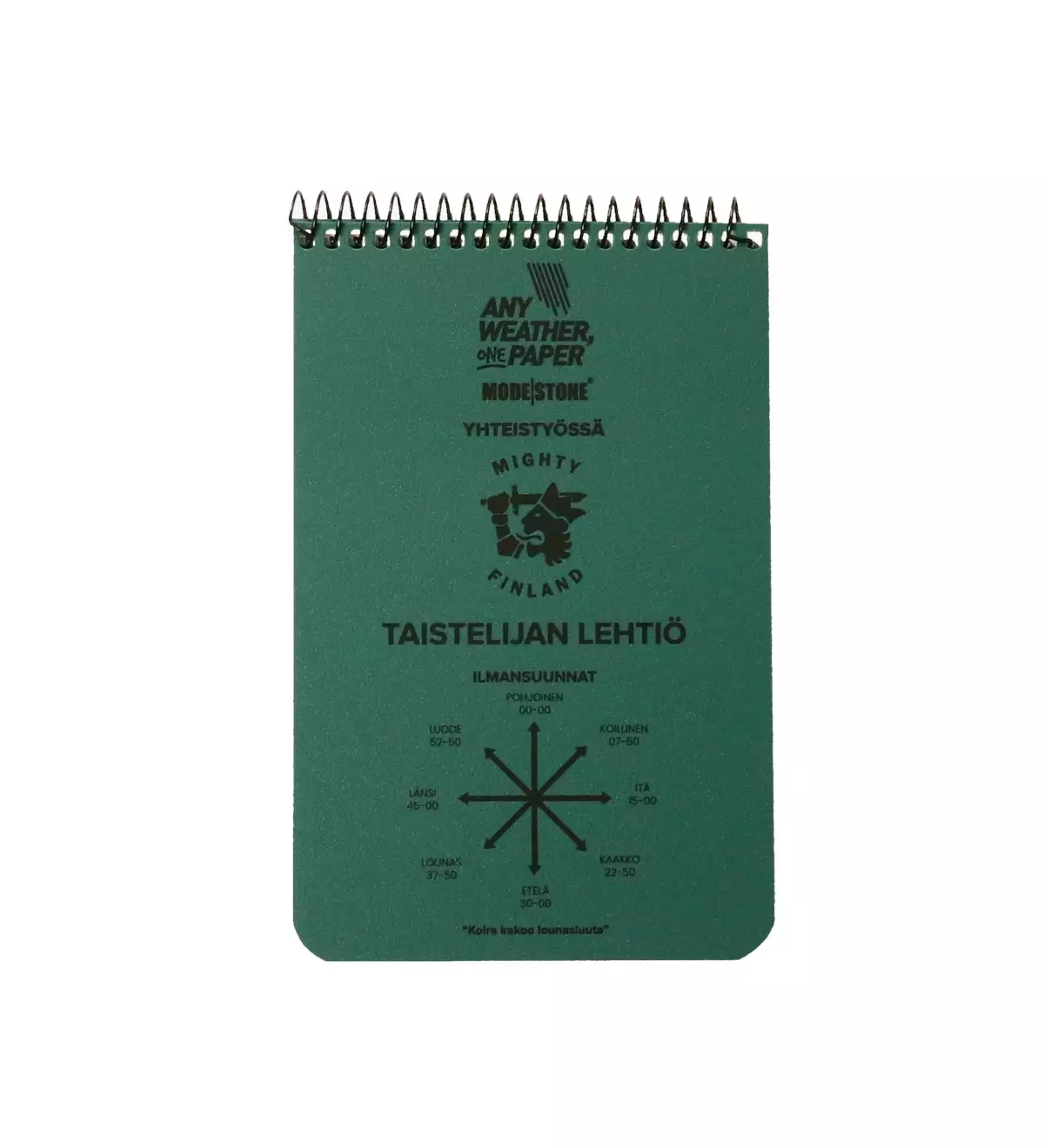 Modestone Mighty Finland taistelijan muistilehtiö, 96 x 148 mm, vihreä. Tässä varusmiesten ja reserviläistä täydellinen unelma. Yhdessä Mighty Finlandin kanssa Suomessa kivipaperista valmistettu vedenkestävä muistivihko, jossa paljon elämää helpottavia mittataulukoita, muistisääntöjä ja muita ohjeita. Tämä on varsinainen muistivihkon ja sotilaan taskutietokirjan ristisiitos. Taistelijan lehtiö on suunniteltu vaativiin olosuhteisiin, joissa perinteinen paperi ei kestä. Kompakti (96 x 148 mm) lehtiö on valmistettu huippulaadukkaasta, täysin vedenkestävästä Modestone-kivipaperista, joka varmistaa, että muistiinpanot säilyvät joka säällä. Lehtiö sisältää olennaiset ohjeet ja muistiinpanojen kirjaamiseen tarvittavan tilan, joka tekee siitä käytännöllisen ja kestävän työkalun kenttäkäyttöön.