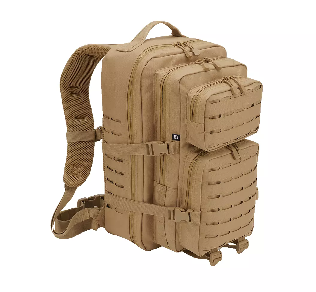 Reppu Brandit Assault Pack, Large, LaserCut, khaki. Brandit Assault Pack LaserCut Large rynnäkköreppu on kestävä päiväreppu kaikenlaiseen harrastustoimintaan. Repussa on yksi iso päätasku, jonka sisällä kaksi pienempää taskua kaikenlaiselle pikkutavaralle, joista toinen verkkotasku. Repun selkäosassa on iso velcro -tarralla avattava lokero juomarakolle tai vaikka pienelle läppärille tai padille. Päätaskun jälkeen on toinen isohko tasku, jossa myös pienempiä taskuja sisällä. Tämän lisäksi edessä kaksi pintaan ommeltua pienempää taskua. Näistä pienemmässä ei ole sisätaskuja, mutta isommasta löytyy lokero lehtiölle ja kynille. Reppu on valmistettu kestävästä paksusta nailonista, joka on pinnoitettu PVC:llä, joten kestää kosteutta varsin hyvin. Reppu ei kuitenkaan ole täysin veden pitävä. Kaikki lokerot sulkeutuvat vetoketjuilla poislukien juomarakon tasku repun takaosassa. Repussa on riittävästi säätövaroja sekä lasercut molle -kujastoja (modular system), joihin saa kiinni kaikenlaista tavaraa sekä erillisiä molle -pusseja.