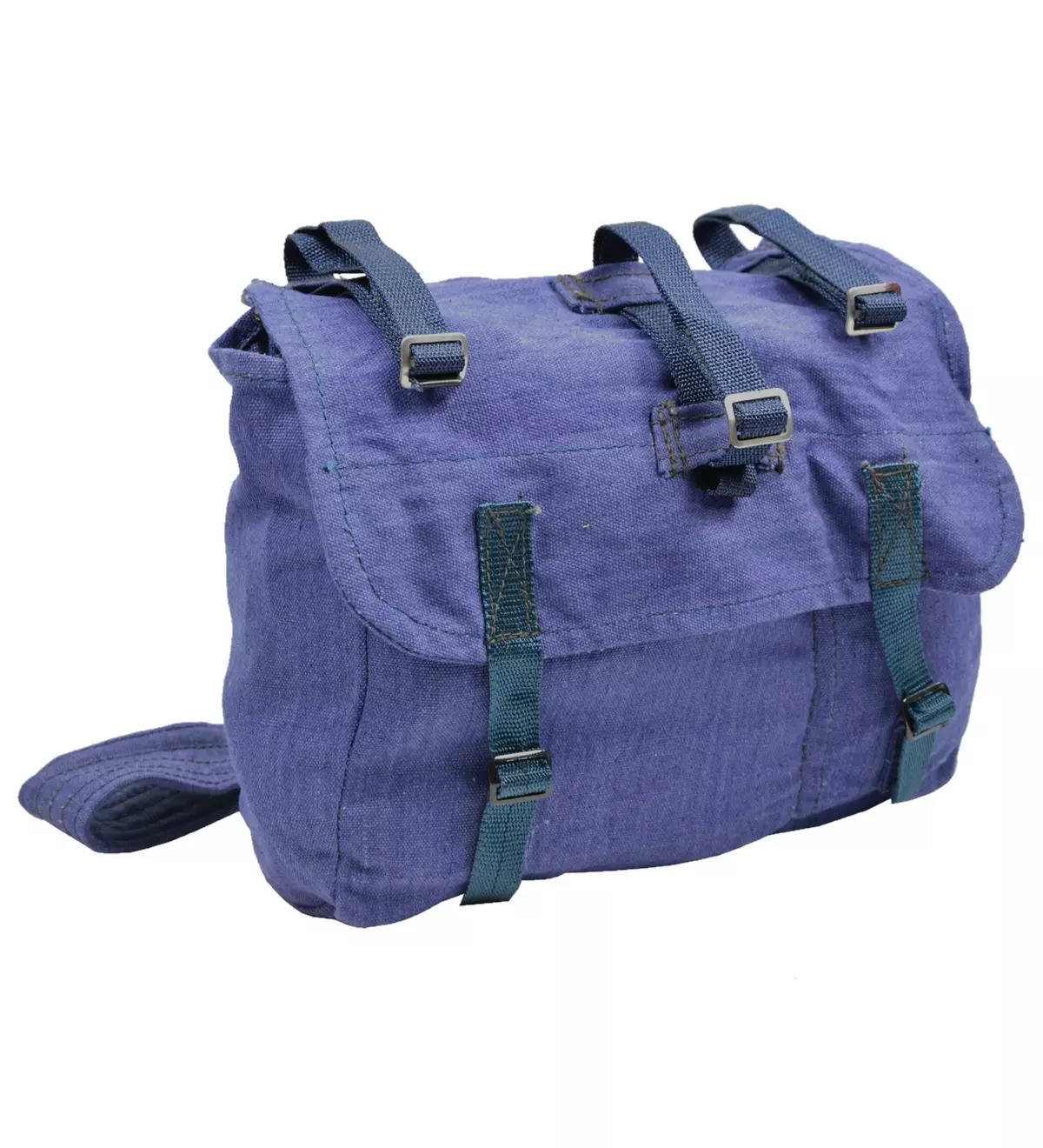 Romanialainen leipälaukku, sininen, ylijäämä. Atentie!!! Tässä todella magee romanialainen leipälaukku olkalaukuksi! Valmistettu puuvillakankaasta, hihnojen soljet metallia. Laukun sisäosa on jaettu kahteen tilaan, jonka korkeutta pystyy jonkin verran säätämään pääliläpän sulkuremmeillä. Tilan mitat ovat noin 32 x 28 x 12 cm, joten on mukavan kokoinen päivitäiseen käyttöön. Laukussa on kolme kiristyshihnaa, joista kaksi on laukun päällä. Tähän saat loistavasti kiinni vaikka makuualustan. Lisäksi niiden edessä yksi hihna, johon saat vaikka kiinni pyyhkeen. Laukku on siis loistava picnicille ja pienille retkille.