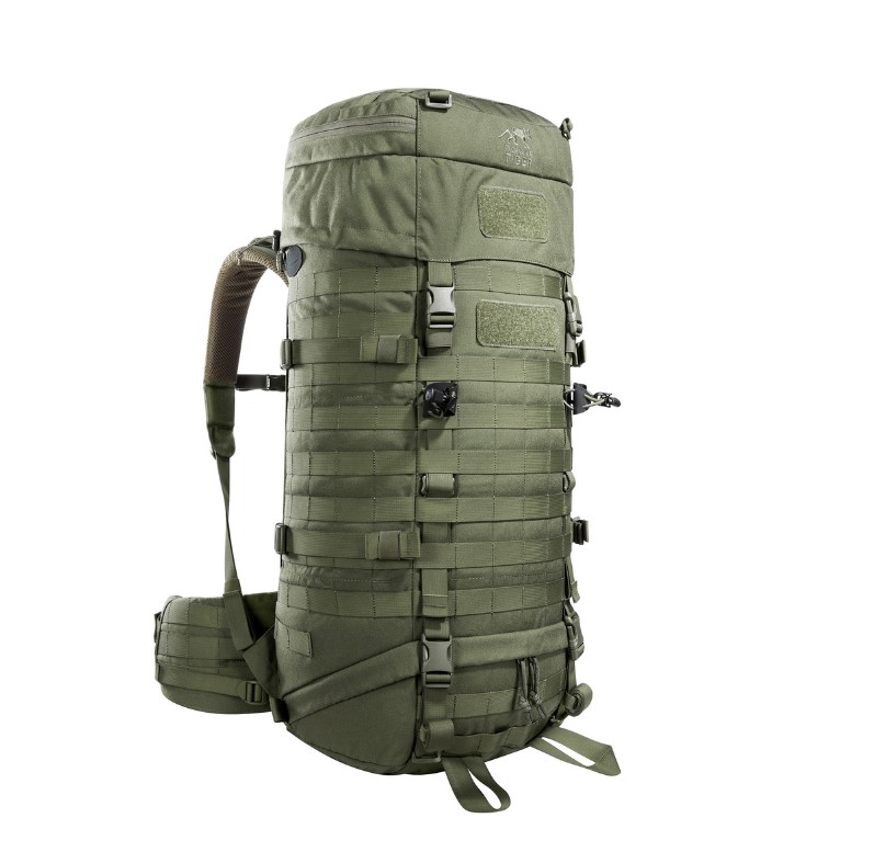 Tasmanian Tiger Base Pack 52 rinkka/reppu, oliivinvihreä. Tasmanian Tigerin 52 - 65 -litrainen rinkka/reppu, jossa mieletön määrä molle -kujastoa. Tämä sopii pidemmillekkin reissuille ja ainutlaatuisen kantojärjestelmän takia on rinkka todella kevyt kantaa, koska paino jakautuu juuri oikeaan paikkaan vartalossa. Rinkassa on iso päälokero, jossa rolltop -pussisulku. Päälokeron alapuolella on pienempi vetoketjusulkeinen lokero. Päälokeron ja pienemmän lokeron välillä vetoketjusuljettava välisulku, jonka voit tarvittaessa aukaista ja saat koko repun sisäosan pituudelta auki. Päälokeron päällä säädettävä kansi, joten voit ylipakata tätä reilusti. Kannessa koko kannen kokoinen vetoketjusuljettava tasku päällä ja sisällä myös vetoketjutasku vaikka ensiaputarvikkeille. Kannen päällä molle -kujastoa (4 x 6) ja edessä pörrötarrapaikka, johon saat vaikka Suomen lipun. Sekä edessä, että sivuilla on tännä molle -kujastoa, joten tähän saat melkein minkä vain taskun kiinni. Sivuissa ylhäällä on kummallakin puolella juomarakon letkulle aukko ja päälokerossa juomarakolle oma tasku ja riiputuslenkk. Rinkassa (repussa) on Tasmanian Tigerin V2 Plus-System kantojärjestelmä, jossa hyvät säätömahdollisuudet eri pituisille ja kokoisille ihmisille. Lantioremmi on hyvin pehmustettu. Kantojärjestelmän yläpäässä on vahva kanto/otto -kahva.