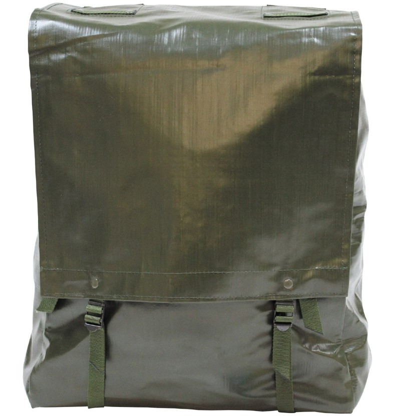 Tsekkiläinen M85 vinyylireppu, ylijäämä. Reppu joka on tehty PVC-vinyylistä. Mitäs tästä nyt voi sanoa. Ruma kun p....le mutta ainakin kamat pysyy kuivana. Tilavuus on siinä 50-60 litran tietämissä ja olkaimet ergonomialtaan rautaesiripun takaista tasoa. Pääliläppä on suorastaan massiivinen joten tätä voi ylipakata melko paljon.