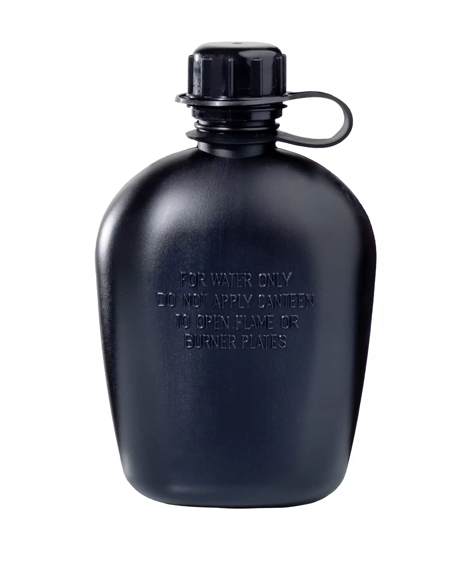 US kenttäpullo 1 L, musta. Litran vetoinen BPA vapaa kenttäpullo elintarvikemuovista. Korkissa karkeat kierteet. Korkki on kiinnitetty kenttäpulloon, joten ei pääse häviämään. Tämä on jenkkiarmeijan pullosta kopiotu ja sopii alumiiniseen jenkkiarmeijan ruokakippoon.