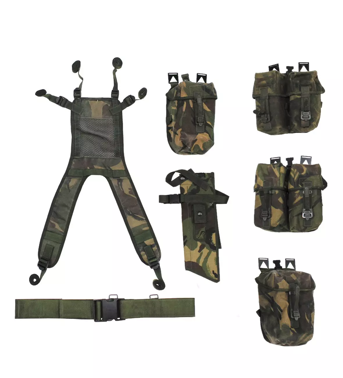 Brittiläinen 7- osainen tetsari -setti, DPM, ylijäämä. Brittien 7 -osainen tetsarisetti DPM (Disruptive Pattern Material) maastokuviolla. Setissä on vyö, valjaat, 2 x tuplalipastaskuja, 2 x yleistaskuja sekä 1 x viidakkoveitsitasku. Hyvä aloitussetti esimerkiksi airsoftiin. Valjaat ja vyö ovat pituus säädettävät. Lipastaskut ovat tarkoitettu Stanag -lippaille, mutta miksei käy muillekkin sopiville lippaille.