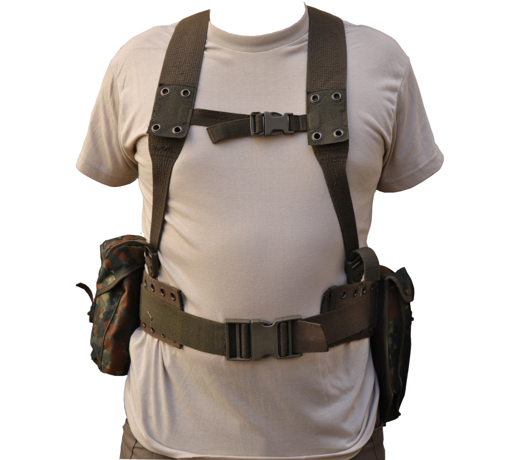 BW 5 -osainen tetsarisetti, flecktarn, ylijäämä. Saksalaisen taistelijan taisteluliivit. Kunnollinen ja kestävä. Pakkauksessa tulee liivin lisäksi lapiotasku, juomapullotasku ja iso yleistasku, johon koko setti pakkautuu nätisti sisään. Näissä on saksalainen oma kiinnitysjärjestelmä, joten uudemmat molle -taskut huonosti käyvät tähän. Tietty jos olet näppärä käsistäsi, niin voit vaikka ommella tähän lisätaskuja kiinni. Kaikkia tuotteita koristaa erittäin tuttu saksalainen flecktarn-maastokuviointi. Hyvä aloitussetti vaikka airsoftiin tai pihapeleihin.