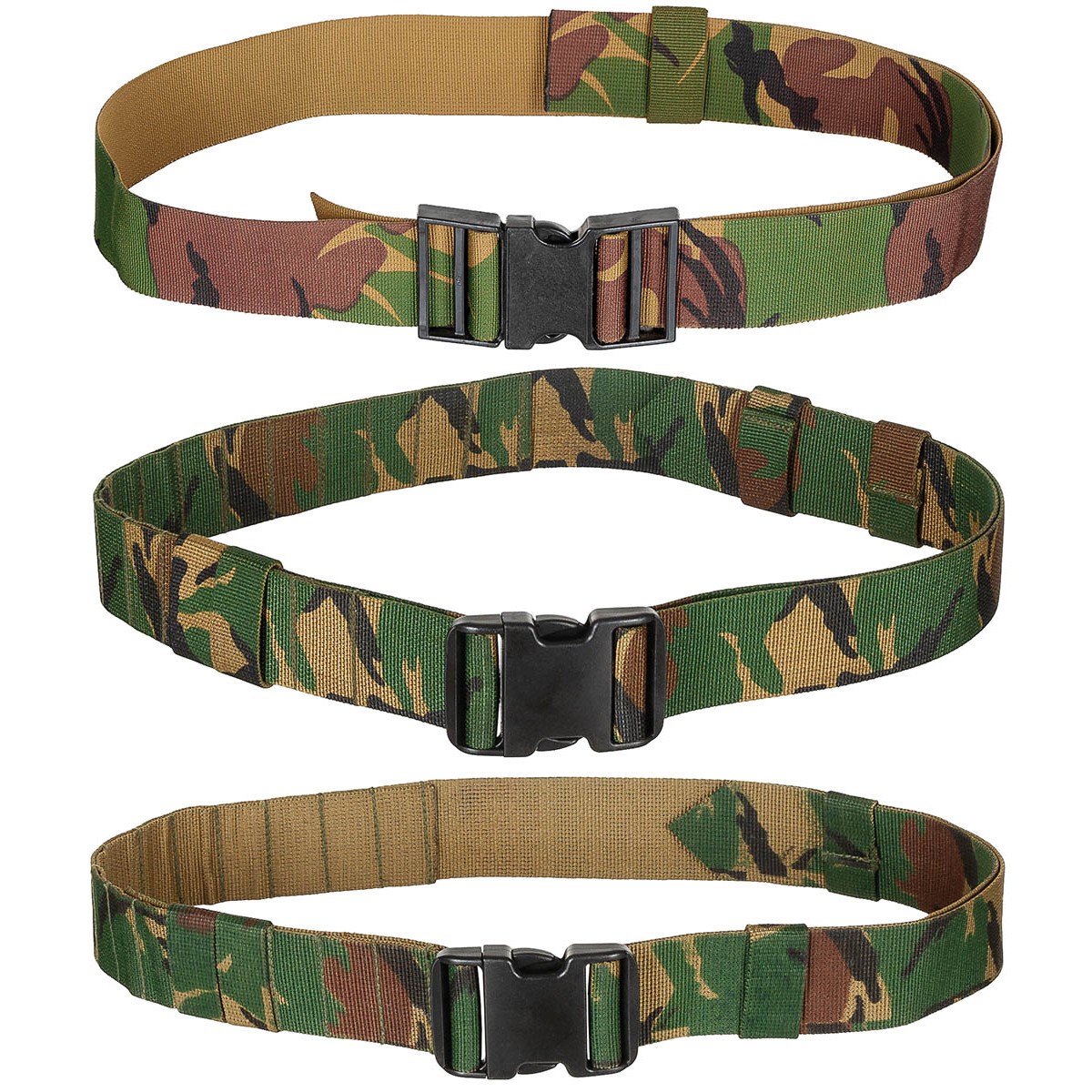 Hollantilainen taistelyvyö DPM, ylijäämä. Yksinkertainen on kaunista! Hollannin armeijan taisteluvyö DPM (Disruptive Pattern Material) -maastokuviolla ja muovisella pistosoljella. Nää on siitä hyviä, ettei tarvitse valita monesta eri koosta vaan tämä on säädettävissä lähes 140 senttiin saakka! Saattaa olla eri malleja, joissa erilainen pistosolki. Toisella puolella alice- taskuille kujastot. Vyö ei ole kovin jäykkä vaan tämä menee vaikka housuvyönä tms. käytössä.