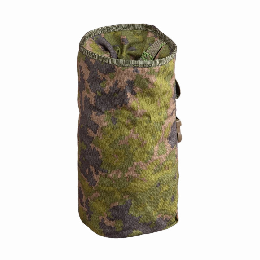 Savotta dump pouch, tyhjien lippaiden tasku, M05 Woodland. Siisti, yksinkertainen ja tukeva dumppitasku tyhjille lippaille ja sekalaisille tavaroille. Taskuun mahtuu noin 4-5 rynnäkkökiväärin normaalipituista lipasta, mitoitettu 30 patruunan AK/RK lippaiden mukaan. Kiinnitys vie vain kaksi PALS-kujaväliä. PALS-kiinnitys voidaan punoa tukeviksi vyölenkeiksi. Kun taskua ei tarvitse saa sen taiteltua hyvin tiiviiseen nippuun ja suljettua SR-soljella. Taskun yläreunaa kiertävä kanttinauha antaa suuaukolle sopivasti ryhdikkyyttä pitääkseen sen muodossaan ja helppokäyttöisenä, tekemättä siitä kumminkaan kovaa ja periksiantamattoman jäykkää. Sisemmän kauluksen aukko on säädettävissä kuminyörillä isommaksi tai pienemmäksi.