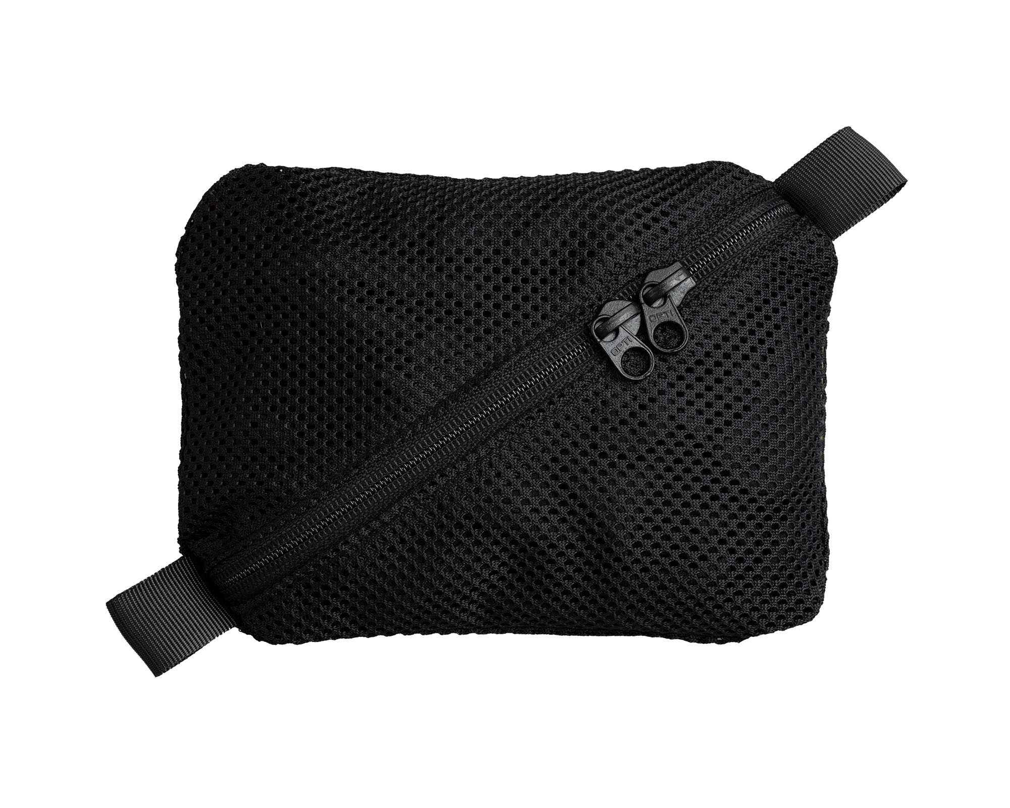 Pussin sisältö näkyy verkkokankaan läpi. Kulmasta-kulmaan vetoketju. 25 mm leveät nauhalenkit kulmissa. Useita värivaihtoehtoja nopeaa tunnistusta varten (musta, vihreä ja oranssi). Tarrakiinnityksellä (hook back)