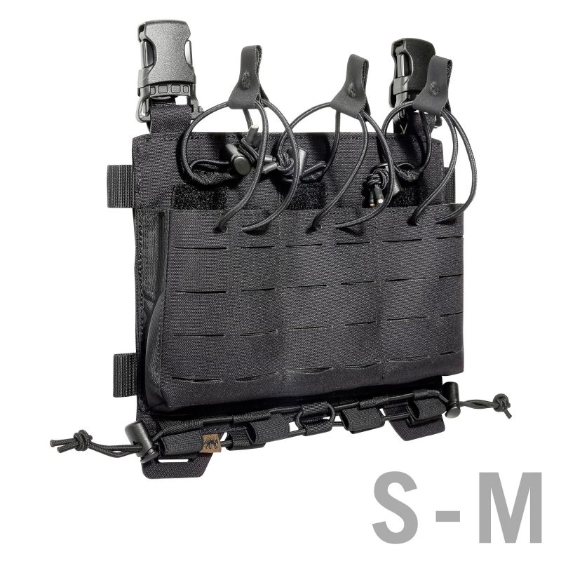 TT Carrier Mag Panel LC M4 pienempii S-M koko, kolmelle lippaalle, musta. Vaihto etupaneeli taisteluliiveihin. Laser leikattu MOLLE-kujasto. Suunniteltu pitämään M4, G36 PMAG, Steyr ja vastaavan kokoisia lippaita. Voidaan käyttää yhdessä Tasmanian Tigerin MK IV, LC ja QR LC Plate Carrierien kanssa.