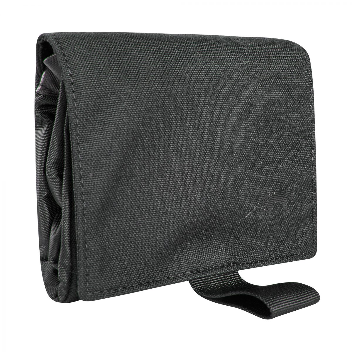 Tasmanian Tiger Dump Pouch MK II, Musta Kätevä mollekiinnitteinen dumppitasku joka rullaantuu pieneksi paketiksi pois tieltä kun taskua ei tarvitse. Avautuu helposti kiskaisemalla vain velcrokiinnitteisen kannen auki ja levittämällä pussin. Pussin suussa on nyörikiristys jolla suuaukkoa saa pienemmäksi estämään esimerkiksi tyhjien lippaiden ulos pomppimista nopeammassakin menossa, nyöritetty suuaukko sekä pussin sisäpinta on myös kumitettu vahvistamaan rakennetta ja kangasta.