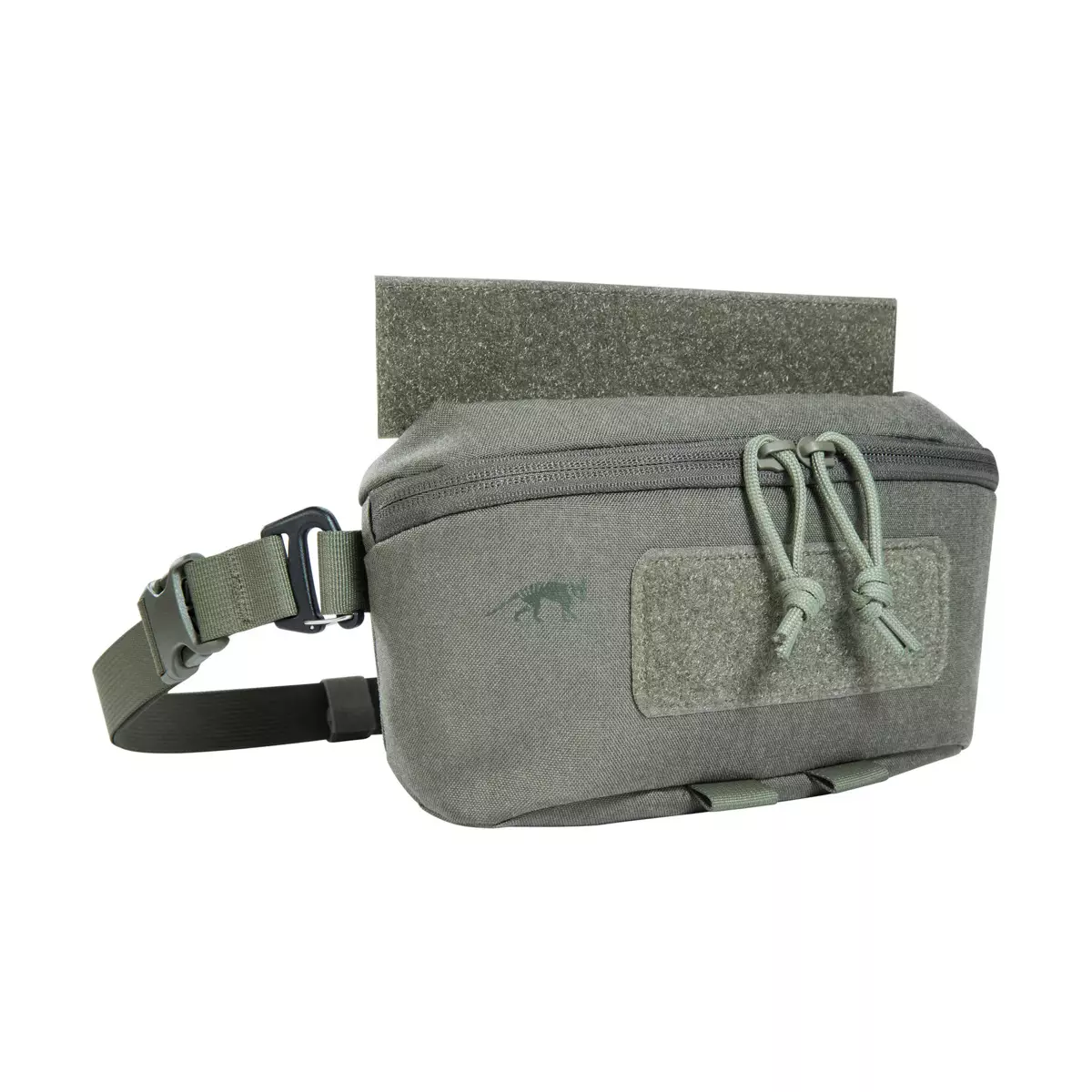 Tasmanian Tiger Plate Carrier Pouch VL, IRR, stone grey olive. Täysin uusittu hanger- tasku, joka toimii myös vyölaukkuna. Taskussa on kivana uutuutena käännettävä Hook-and-loop Tegris® -levystä valmistettu liitoskappale, joka on irrotettavavissa ja käännettävissä, jolloin liitoskappaletta voidaan käyttää molemmin puolin. Eli voit käyttää tätä melkein missä vaan plate carrierissä. Taskun takana on viidelle valotikulle paikat. Tasku avautuu edestä kahteen suuntaan avautuvalla vetoketjulla. Sisällä takapinnassa on joustavat lenkit, jonne saat kiinni tarvikkeita. Taskun etualareunassa on pienet kujastot, joihin voit pujottaa joustonarua ja saat vaikka kiristyssiteen siihen kiinni. Mukana tulee irroitettava vyötäröremmi, joten voit käyttää tätä sellaisenaan vyölaukkuna. Ja materiaalihan on vahvaa 500 denierin cordurakangasta.